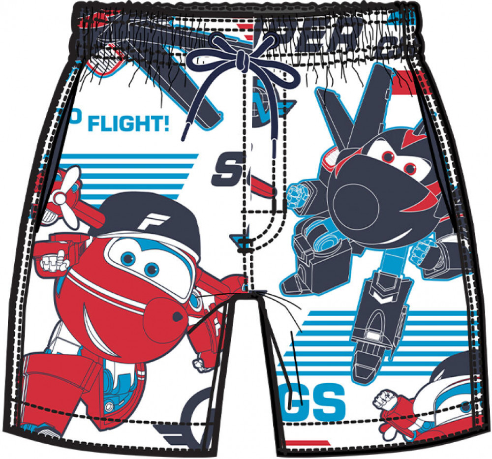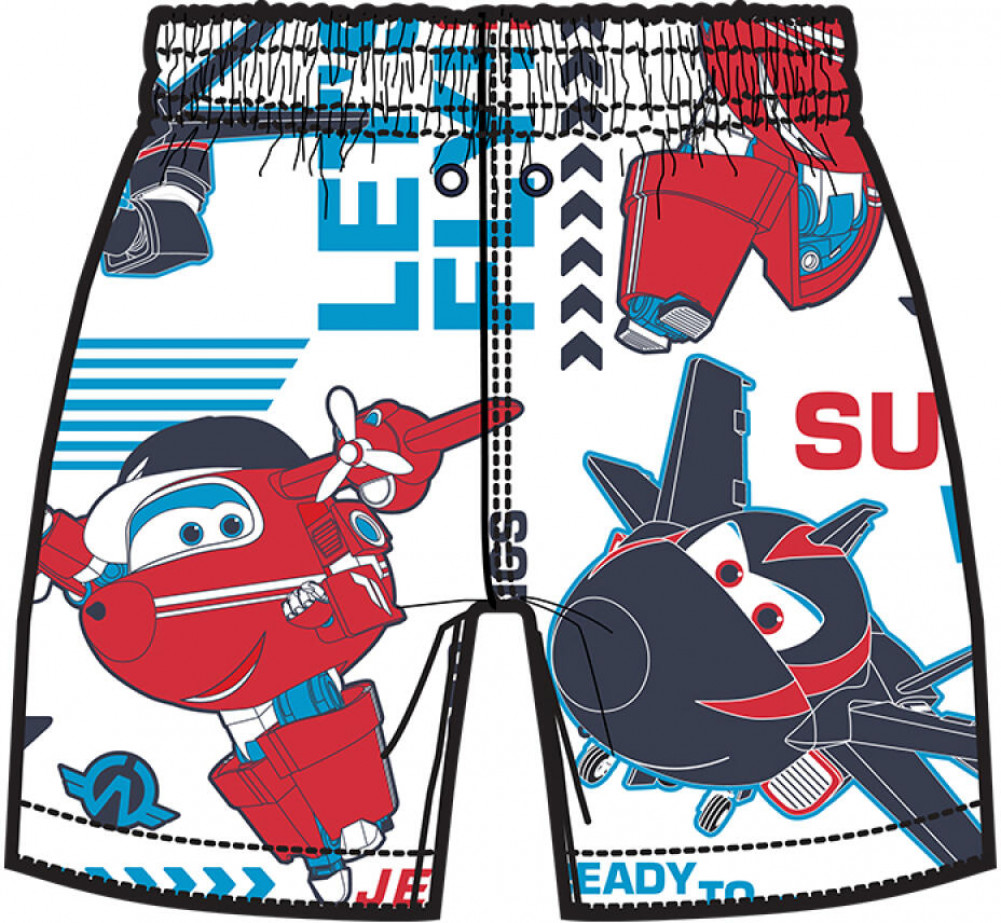 Детские плавательные шорты для мальчика. Модель средней длины с ярким принтом Super Wings. Изделие выполнено из лёгкой быстросохнущей ткани и дополнено внутренней сетчатой подкладкой. Пояс на резинке регулируется шнурком для комфортной посадки. Боковые сетчатые карманы.
