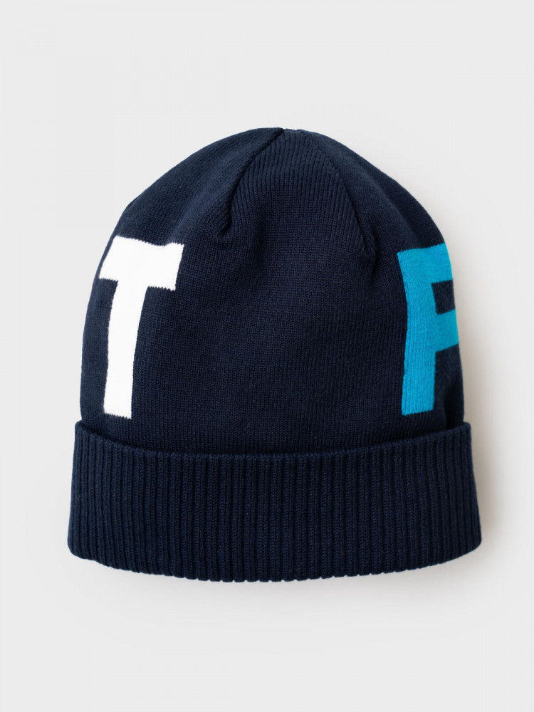 Вязаная детская шапка для мальчика. Модель, из трикотажа с высоким содержанием хлопка. Большая жаккардовая надпись. Одинарная вязка. Внизу — мягкий отворот, который помогает шапке лучше держаться на голове.