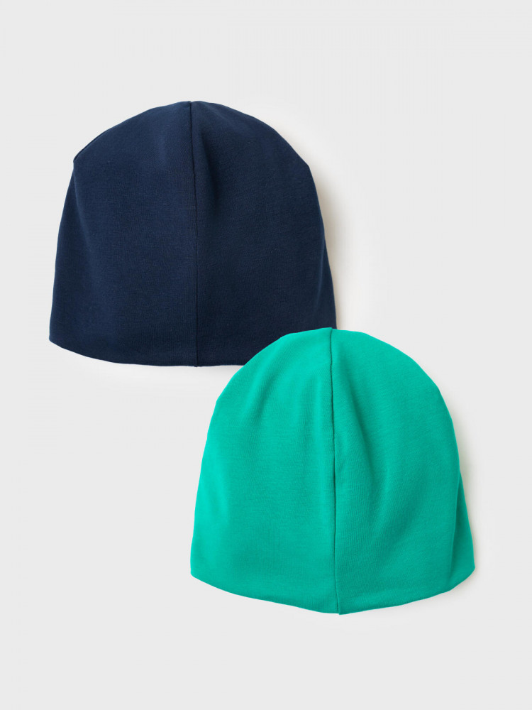 Набор детских трикотажных шапок для мальчика. Материал с высоким содержанием хлопка. 2 шапки в комплекте. Спереди размещен крупный рисунок.