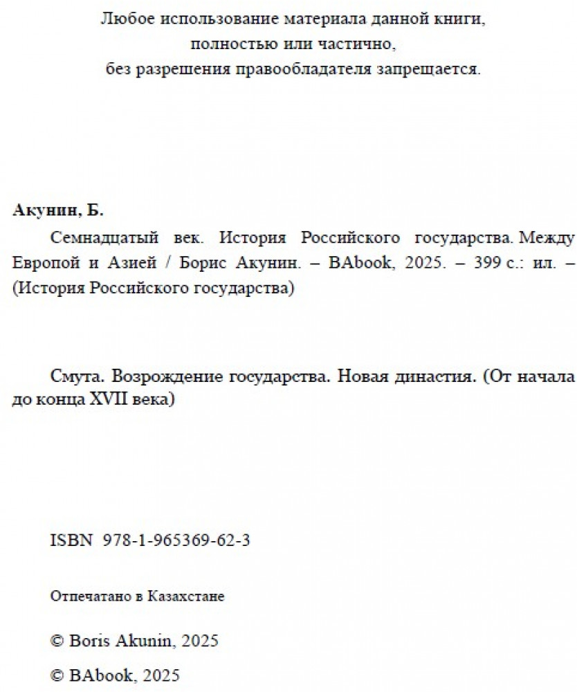 💳 Оплатить за товар можно при получении 🇰🇿 Есть бесплатная доставка по Казахстану от 1 дня 🎁 Копите бонусы с каждой покупки Серия: История Российского государства «Семнадцатый век. Между Европой и Азией» — книга Бориса Акунина из цикла «История Российского государства». Произведение посвящено истории третьего по счёту российского государства, возникшего в результате Смуты и просуществовавшего меньше столетия — вплоть до новой модификации. |