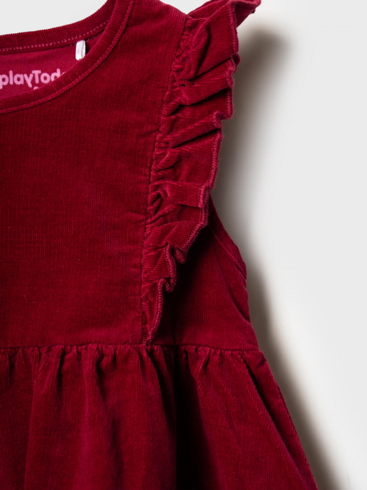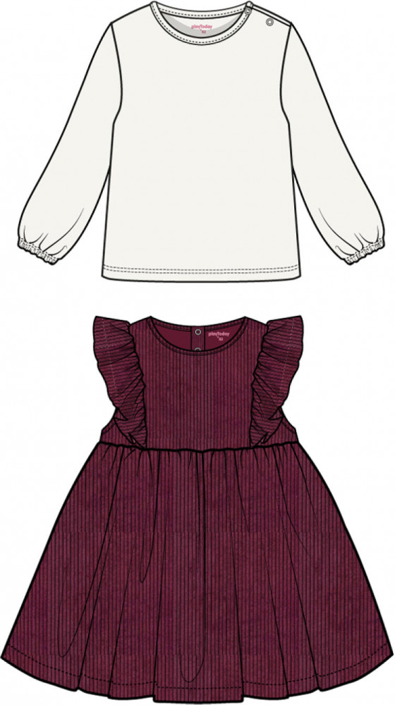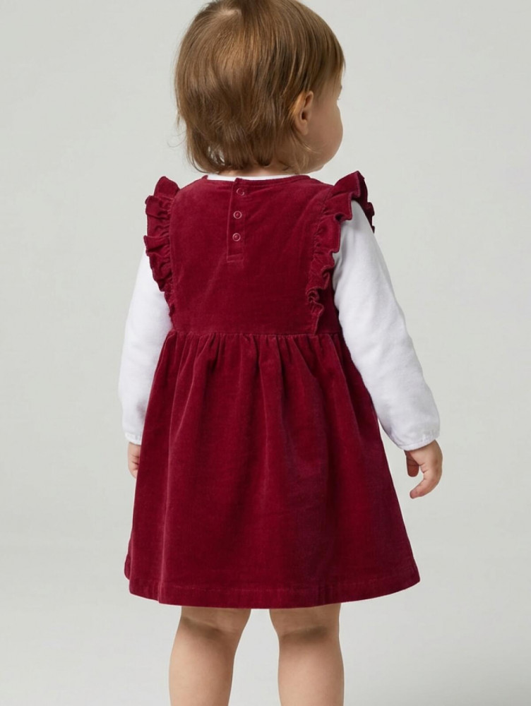 Детский комплект для девочки. Состоит из вельветового сарафана и хлопкового лонгслива. Платье с рукавами-крылышками и застежкой на кнопки сзади. Лонгслив имеет застежку на кнопки на плече для удобного переодевания. Манжеты на мягкой резинке.