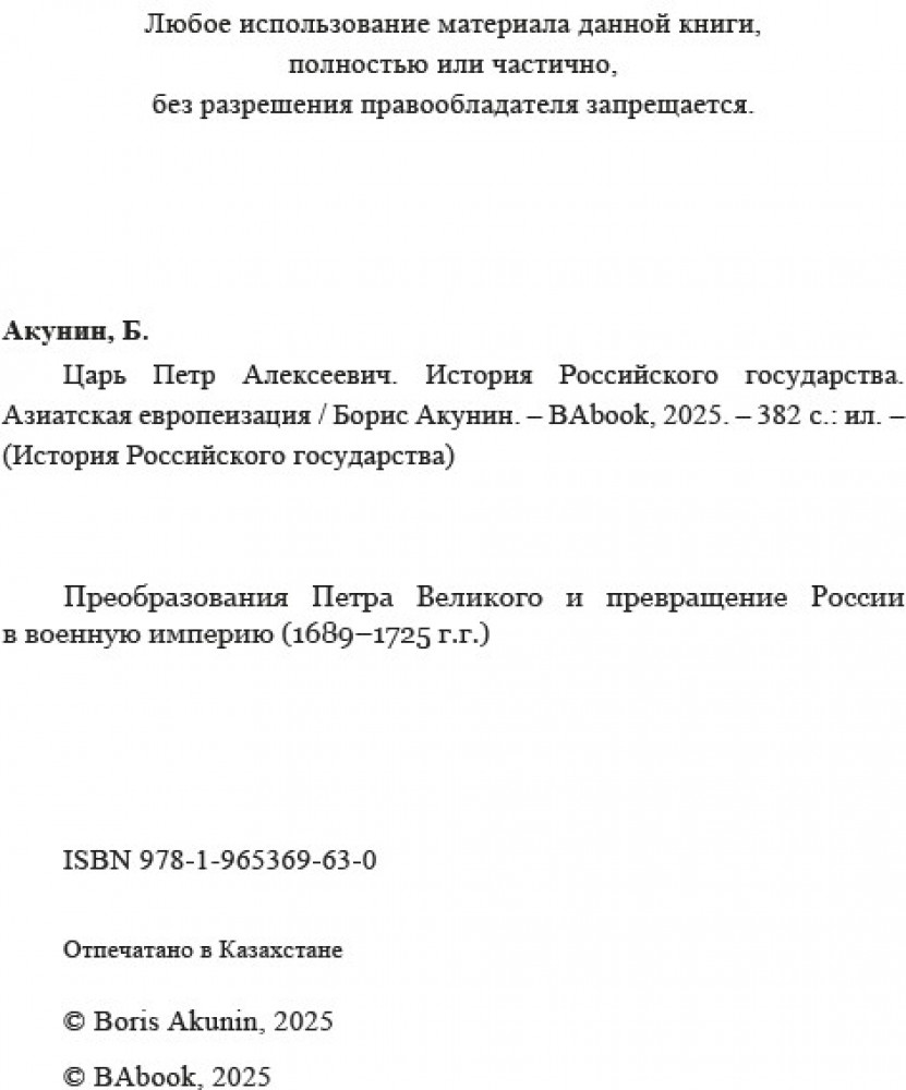 💳 Оплатить за товар можно при получении 🇰🇿 Есть бесплатная доставка по Казахстану от 1 дня 🎁 Копите бонусы с каждой покупки «Азиатская европеизация. Царь Петр Алексеевич» — книга Бориса Акунина, в которой рассказывается о преобразованиях, проведённых Петром I (1682–1725). По мнению автора, тридцатилетие, в течение которого Пётр Алексеевич проводил свои реформы, определило последующую судьбу страны и существенно повлияло на ход мировой, прежде всего европейской истории. |
