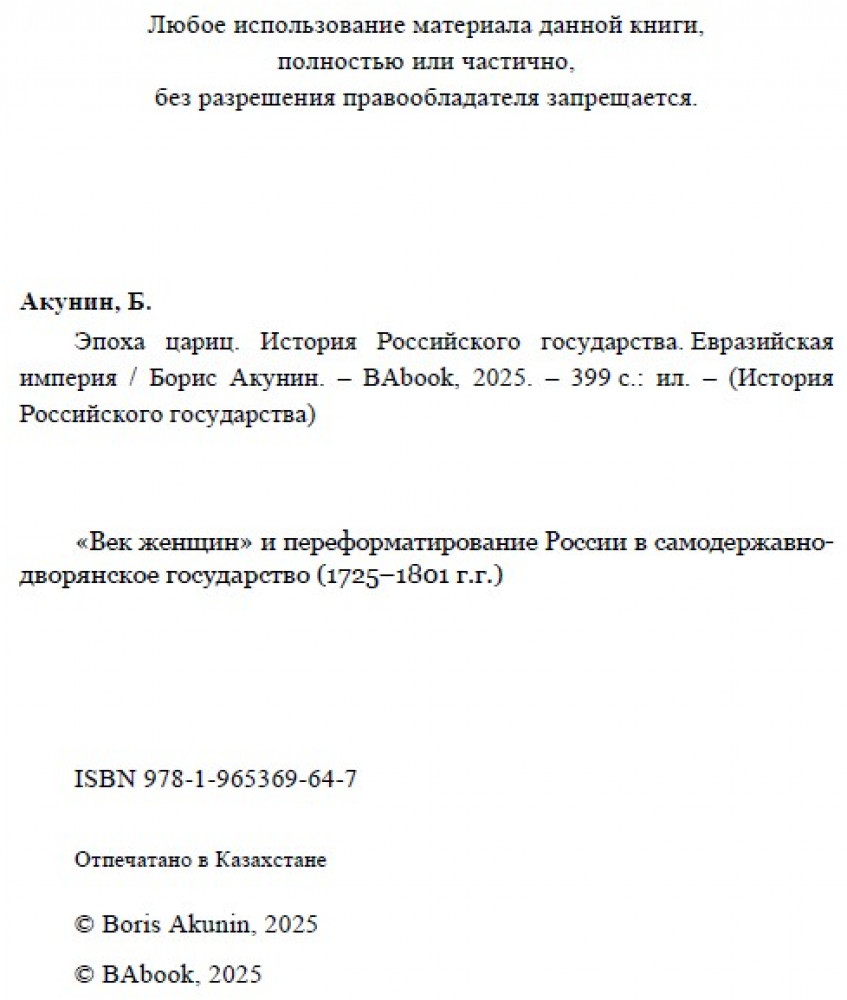 💳 Оплатить за товар можно при получении 🇰🇿 Есть бесплатная доставка по Казахстану от 1 дня 🎁 Копите бонусы с каждой покупки Серия: История Российского государства «Эпоха цариц» — документальное произведение Бориса Акунина из цикла «История Российского государства». В книге рассказывается о событиях русского XVIII столетия — периоде, когда Россия превратилась в евразийскую империю, расширяющуюся на запад, юг и восток. Автор делает вывод, что это время преподает несколько важных уроков: об ограниченности неограниченной власти, о необходимости и рискованности реформ, о том, как можно и как нельзя править Россией. Книга также описывает, как завязывались «вечные» российские узлы: национальный вопрос, внутриобщественное противостояние, жажда свободы и страх перед порождаемым им хаосом. Произведение богато иллюстрировано, снабжено картами и хронологическими таблицами. |