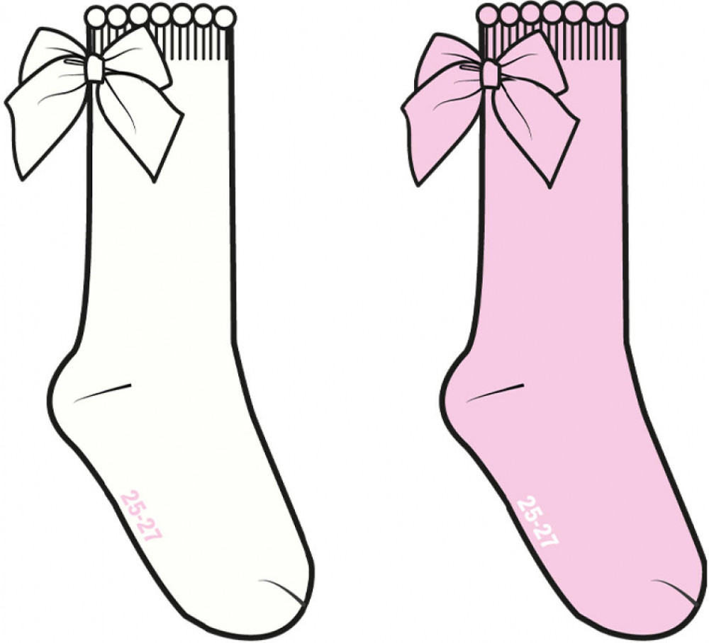 Набор из двух пар детских носков для девочки. В комплект входят носки двух расцветок: одна пара выполнена в нежном розовом цвете, вторая — белая с акцентами. Декорированы бантами. Носки выполнены из мягкого хлопкового трикотажа, хорошо тянутся и комфортно сидят на ноге благодаря эластичной резинке в верхней части. Усиленные мысок и пятка.
