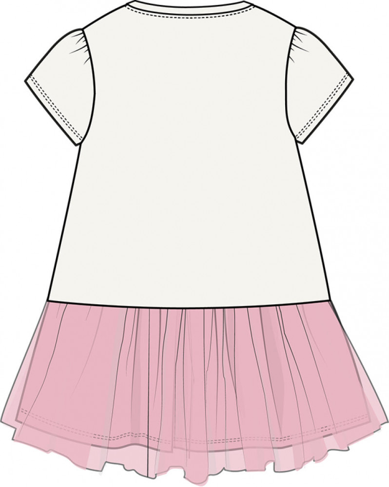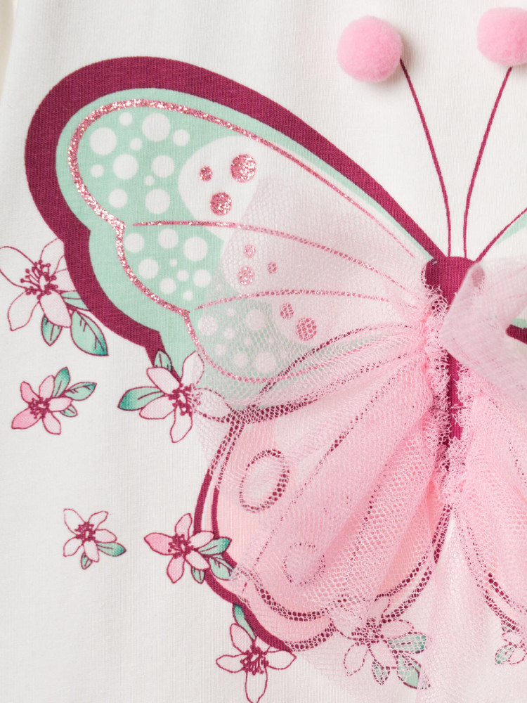Нарядное детское платье для девочки. Модель из комбинации хлопкового трикотажа джерси и сетки. Верх выполнен в виде футболки с округлой горловиной, рукавами-фонариками и милым принтом бабочки. Бабочка украшена объёмными элементами: крылья из розовой сетки и мягкие помпоны. Нижняя часть — пышная юбочка из двух слоёв розовой сетки. На плече — кнопки, чтобы платье было удобно надевать через голову.