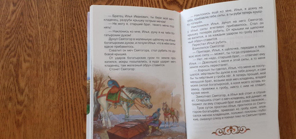 Интересные былины. Некоторые освежила в памяти, некоторые были даже в новинку, ребёнку должно понравиться. В конце есть пояснения слов которые будут не понятны, например околица, пялица и.д. Доставили очень быстро, но не очень качественно. Посылка была вся перемята, сами книги, к счастью не пострадали. Обложка твёрдая,яркая и красочная, картинки внутри красивые, текст крупный, страницы правда жёлтоватые, а не белые и качество бумаги, мне показалось на четвёрку, не больше. Размер книги удобный. Не большая и лёгкая, думаю ребёнку с собой для пятиминутного чтения самое оно, чтобы не добавлять килограммы в итак неподъемный портфель.