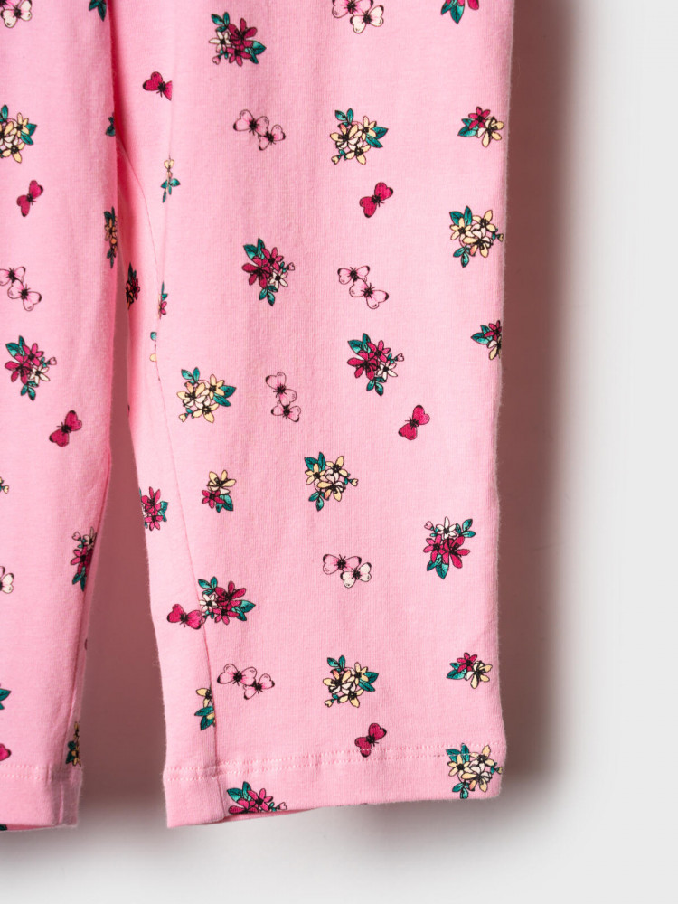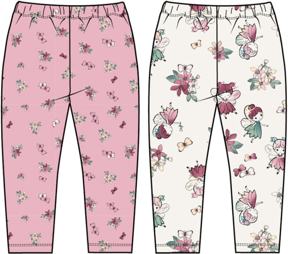 Комплект детских брюк для девочки. Набор из двух брюк выполнен из хлопкового трикотажа джерси. Модель прямого кроя со средней посадкой на талии. Пояс на резинке. Украшены принтами с цветами и феями.