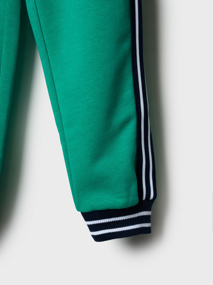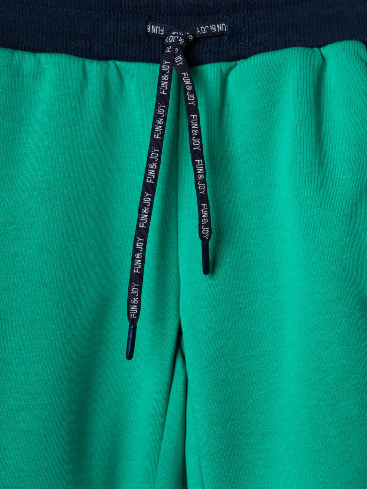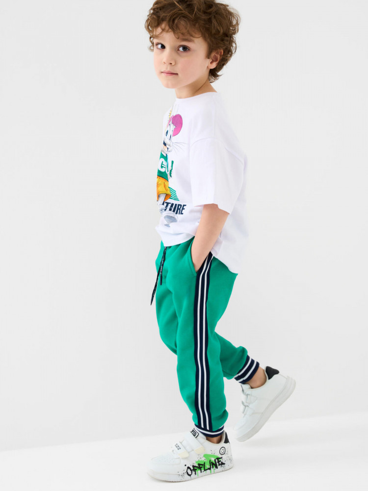 Брюки-джоггеры детские для мальчика. Выполнены из хлопкового трикотажа футер без начеса. Модель прямого кроя со средней посадкой на талии. Пояс выполнен на резинке, дополнительно регулируется шнурком. По бокам — удобные карманы. В нижней части брючин предусмотрены эластичные трикотажные манжеты для лучшей фиксации. Штаны украшены лампасами по бокам.
