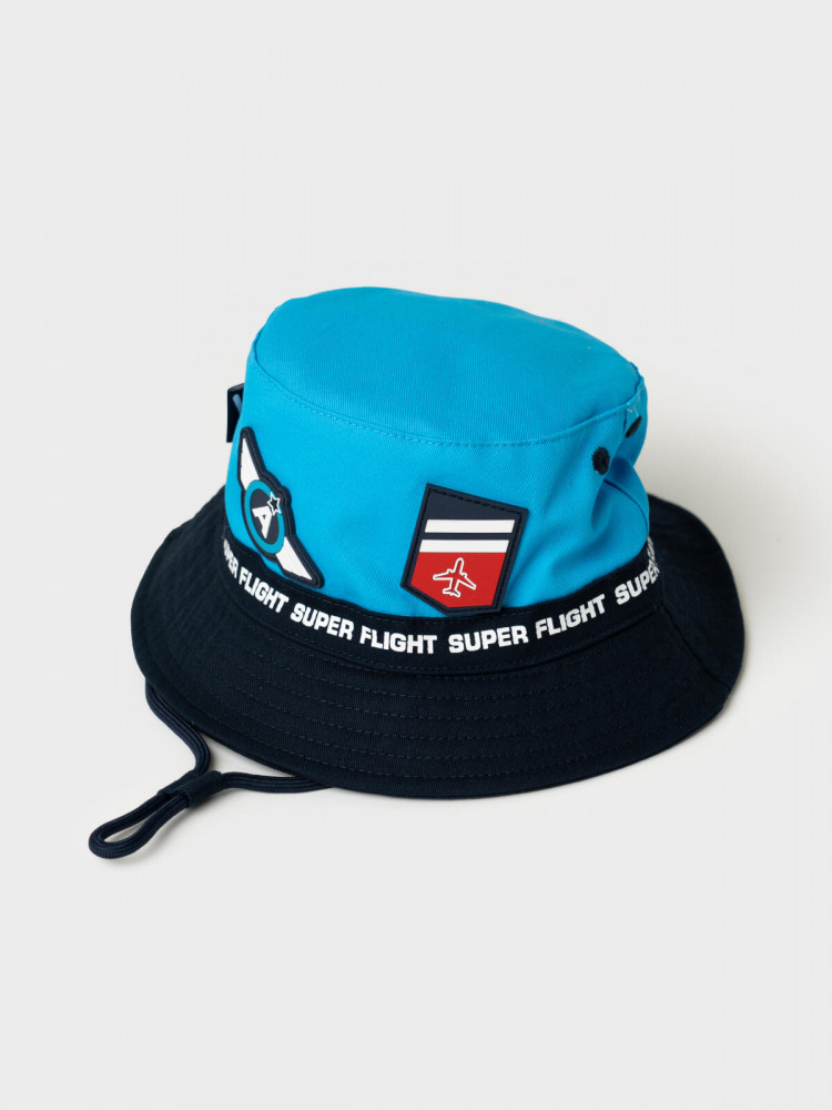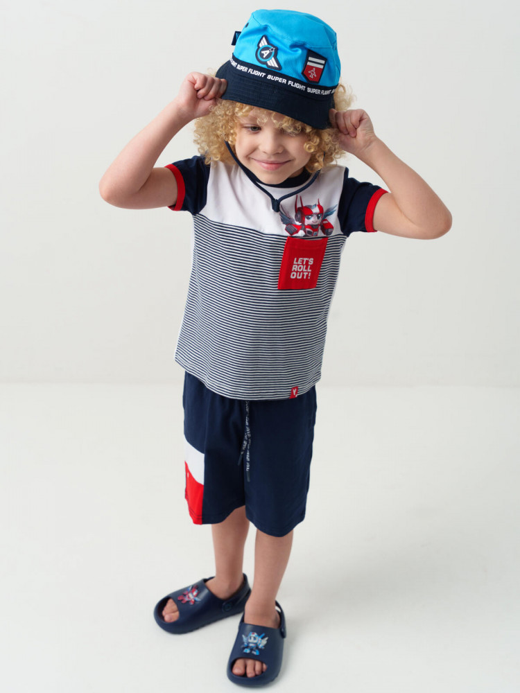 Детская хлопковая панама для мальчика. Для удобства предусмотрены завязки из хлопкового шнура. Панама оформлена декоративной строчкой на полях и имеет вентиляционные люверсы по бокам.