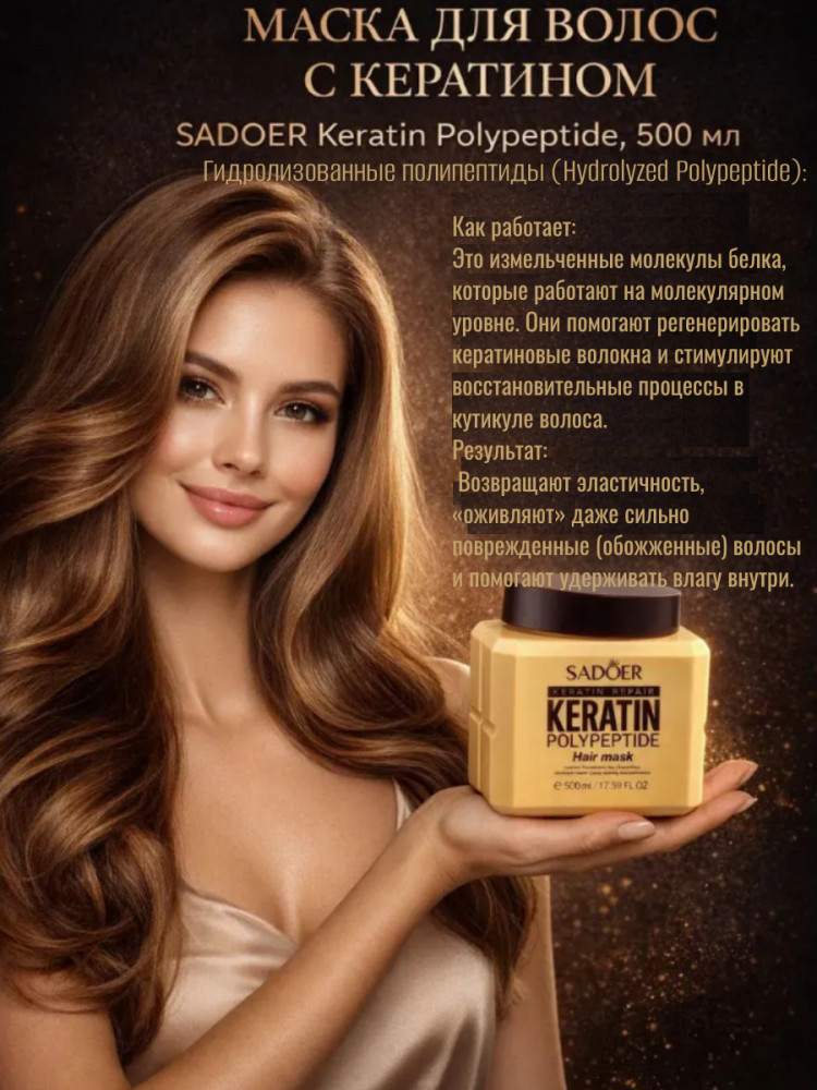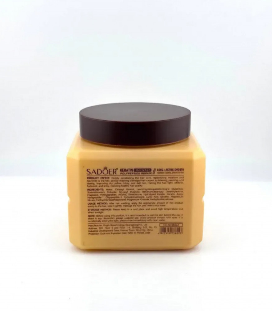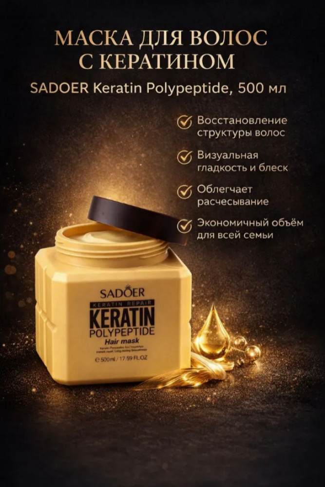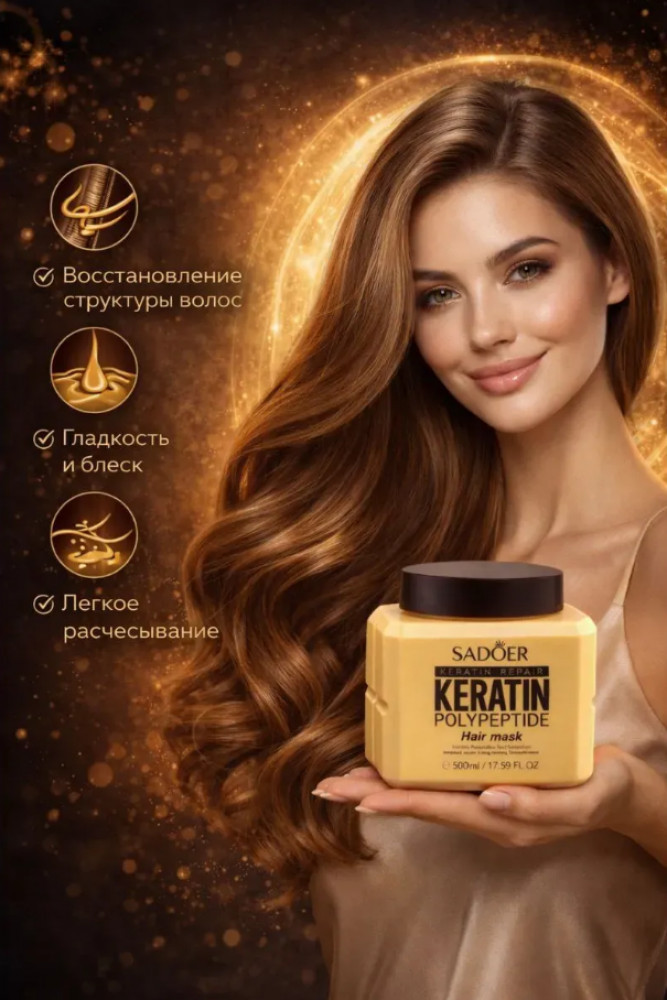 Маска SADOER Keratin Polypeptide имеет насыщенный состав, направленный на глубокое восстановление структуры волоса и создание визуального эффекта гладкости.