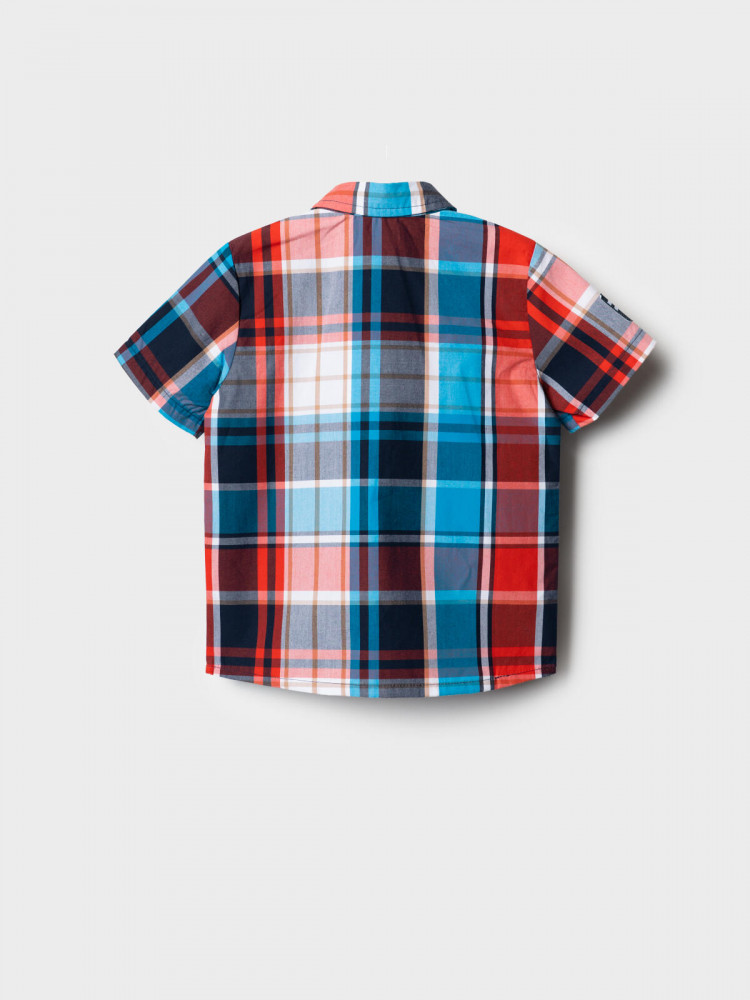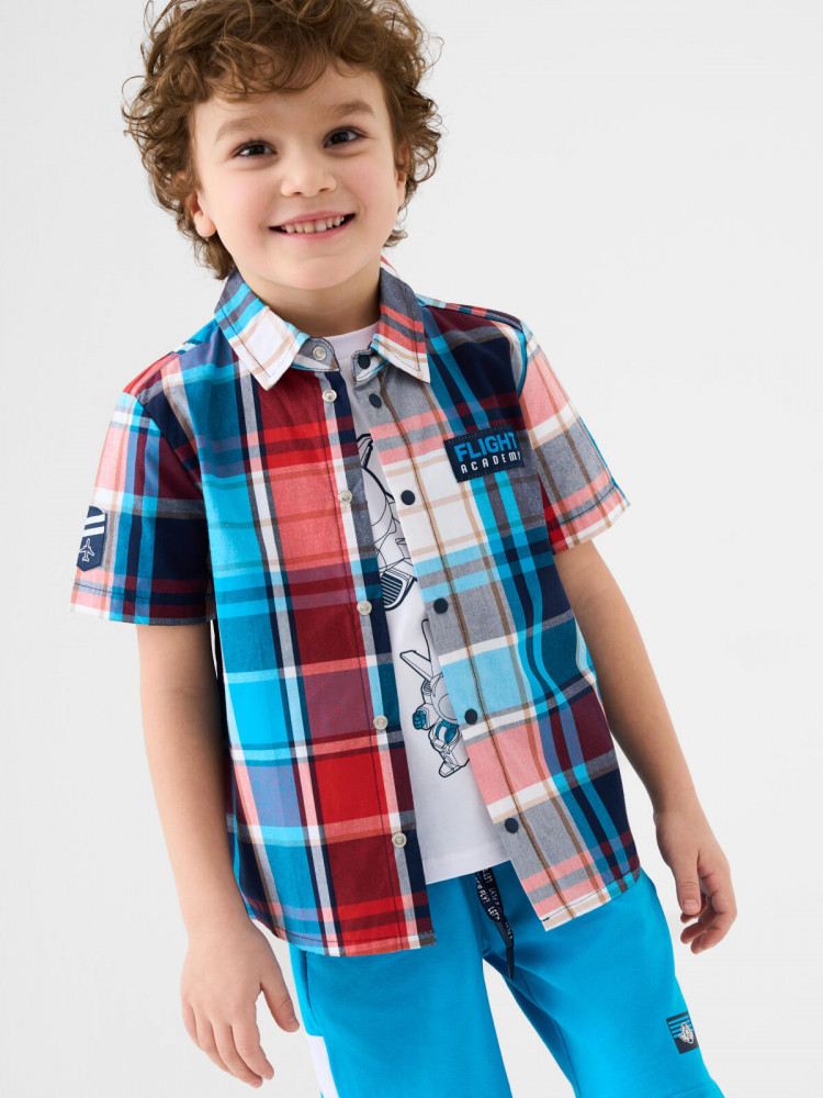 Детская рубашка в клетку для мальчика. Модель прямого кроя, с коротким рукавом. Выполнена из хлопковой ткани поплин. У изделия классический отложной воротник и удобная застежка на кнопки. На груди расположен яркий принт, а на правом рукаве — декоративная нашивка с изображением самолета.