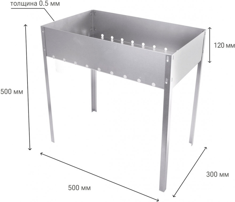 Мангал идеально подходит для приготовления блюд на открытом воздухе. Мангал сборный из стали. Практичен в использовании: удобные длинные ножки создают комфортные условия для приготовления блюд. Компактные габариты 500×300×500 мм позволяют легко переносить мангал и быстро подготавливать его к использованию.