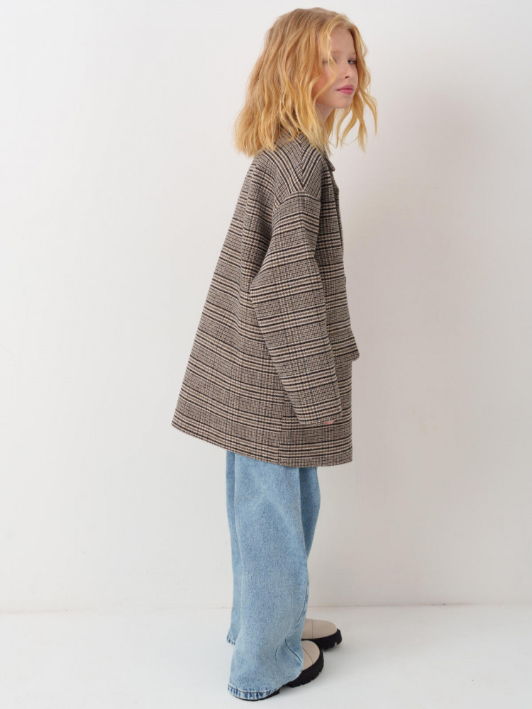 Полупальто двубортное драповое оверсайз для девочки подростка. Температурный режим до +10С. Внутри гладкая подкладка. Два боковых кармана. Все элементы продуманы для удобства и аккуратного внешнего вида. Принт — клетка в коричнево-бежевых тонах.