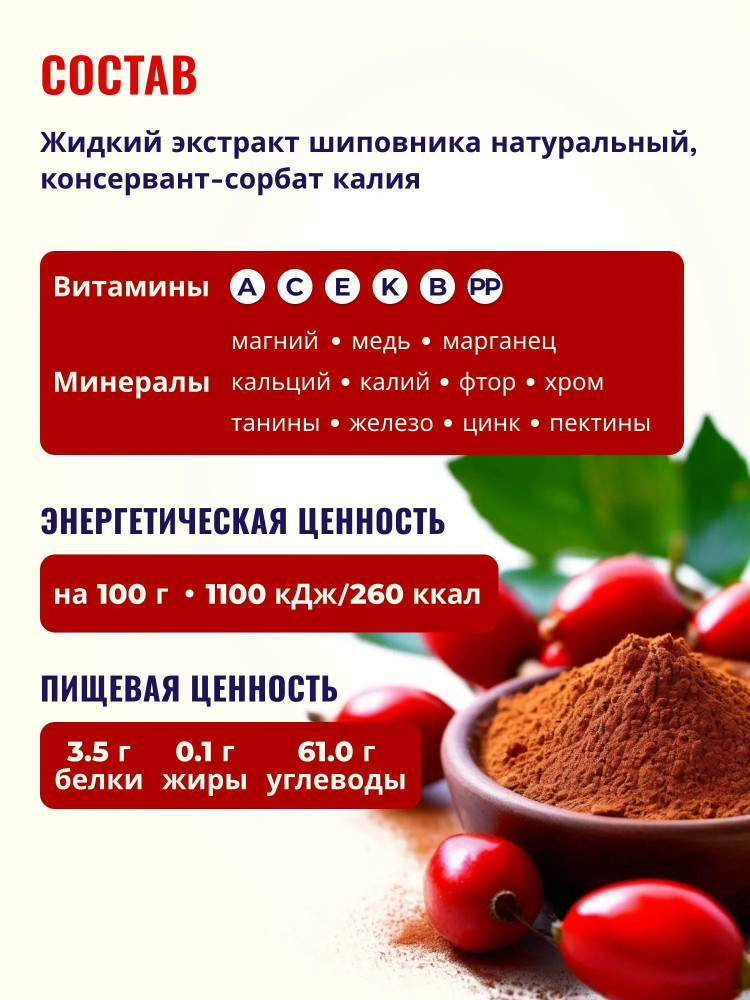 Хотите укрепить иммунитет и поддержать ваш организм в сезон простуд? Регулярное употребление напитков на основе экстракта шиповника угнетает воспалительный процесс и повышает устойчивость организма к инфекциям. Шиповник растворимый жидкий — 100 % натуральный продукт, растворимый в воде. Не содержит ГМО, без глютена и сахара. Является тонизирующим, желчегонным и мочегонным средством, отлично справляется с отечностью. В умеренных количествах молотый шиповник рекомендован беременным и кормящим мамам. Благодаря уникальному технологическому процессу переработки плодов шиповника сушеный напиток сохраняет в себе все полезные компоненты, витамины и микроэлементы. Также полезен, как и сироп шиповника. Одна чашка ягодного напитка в день поможет восполнить сезонный недостаток витаминов, а простудные заболевания пройдут мимо вас.