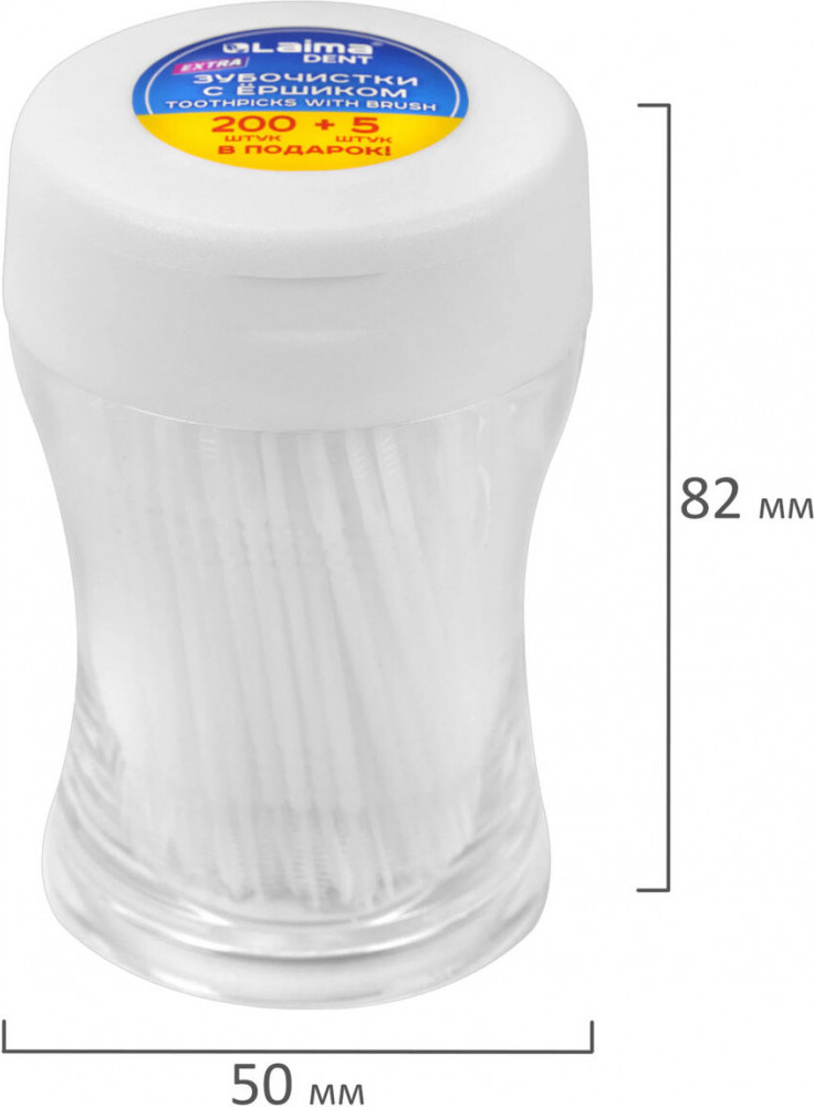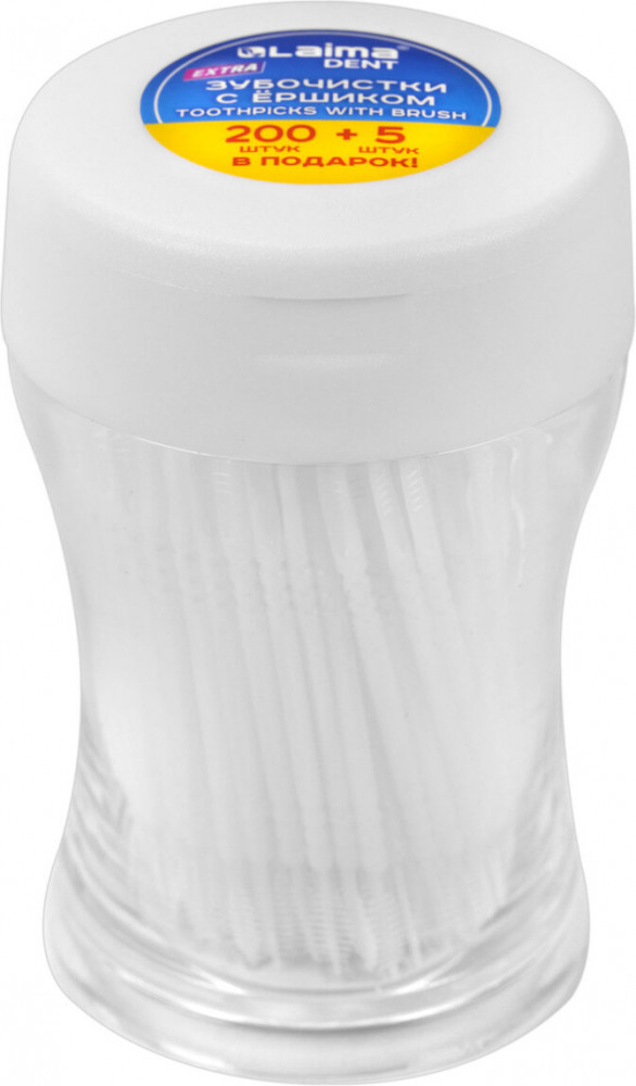 В комплекте 200 (+5) зубных ёршиков, упакованных в удобный пластиковый стакан с крышкой.