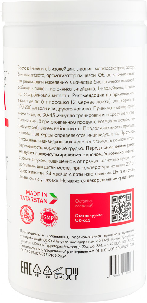 L-лейцин, L-изолейцин, L-валин, мальтодекстрин, аскорбиновая кислота, ароматизатор пищевой.