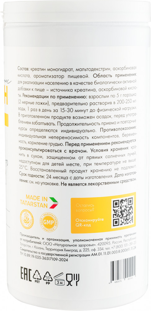 Креатин моногидрат порошок от Natural Health — это способ вывести эффективность ваших тренировок на новый уровень. Чистый состав, без примесей и добавок, позволяет добиваться больших успехов, и увеличения мышечной массы и силы. А профессиональная формула обеспечивает увеличение выносливости во время тренировок или занятий спортом и фитнесом.