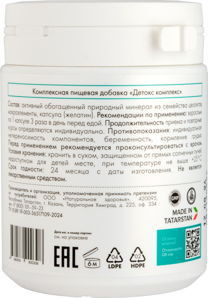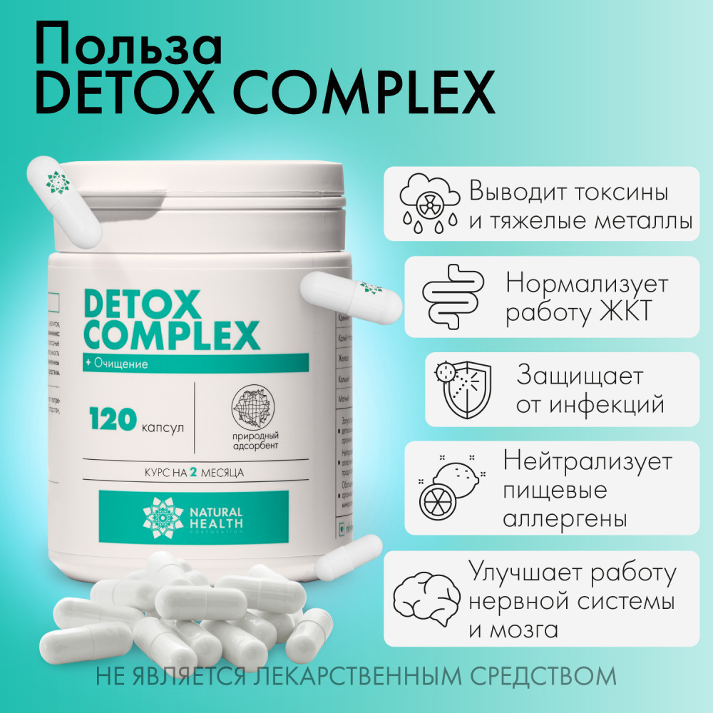 Витамины Detox complex — новейшая разработка компании «Натуральное здоровье» для детоксикации организма. Уникальная и мощная пищевая добавка, созданная специально для тех, кто стремится очистить свой организм от токсинов, способствовать снижению веса и улучшению общего состояния здоровья. Наш детокс-комплекс, содержащий обогащенный очищенный цеолит, природный каолин, кремний, калий, натрий, железо, кальций и магний, помогает облегчить симптомы, связанные с ожирением, диареей, дисбактериозом, рвотой и тошнотой.