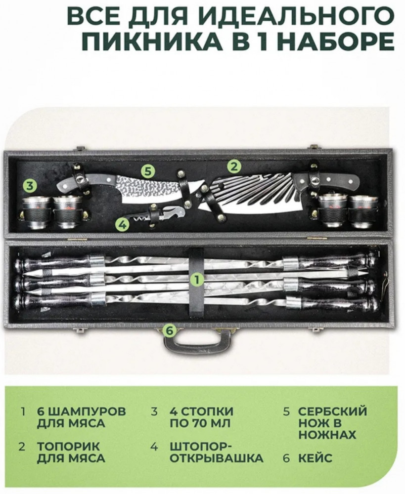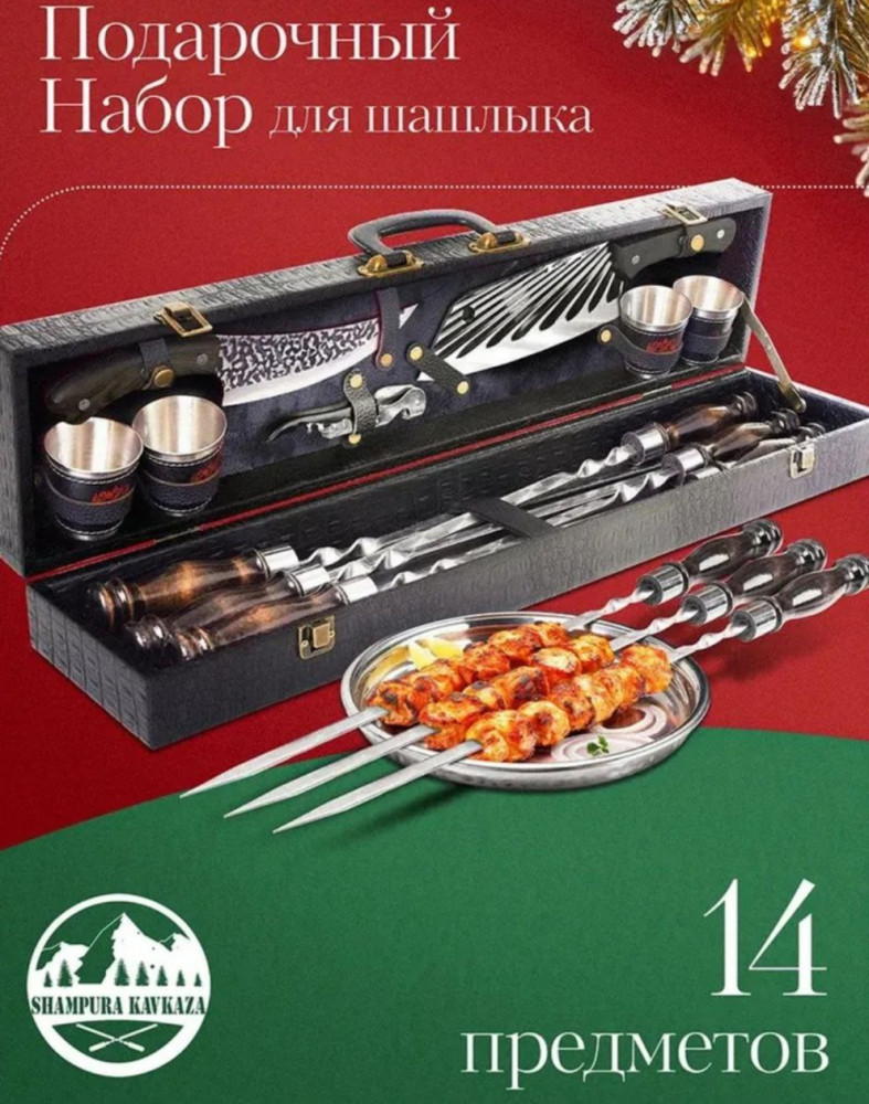 Подарочный набор шампуровВ данный момент этот товар отсутствует в продаже. Возможно, у нас найдется аналогичный или похожий товар здесь. Подарочный набор для шашлыка 14 предметов в стильном и прочном кейсе — идеальный выбор для отдыха на природе, дачи и пикника. В комплект входят шампуры с удобными ручками, нож, топорик, штопор и металлические стопки. Изделия выполнены из качественной нержавеющей стали, устойчивы к коррозии и рассчитаны на долгий срок службы. |