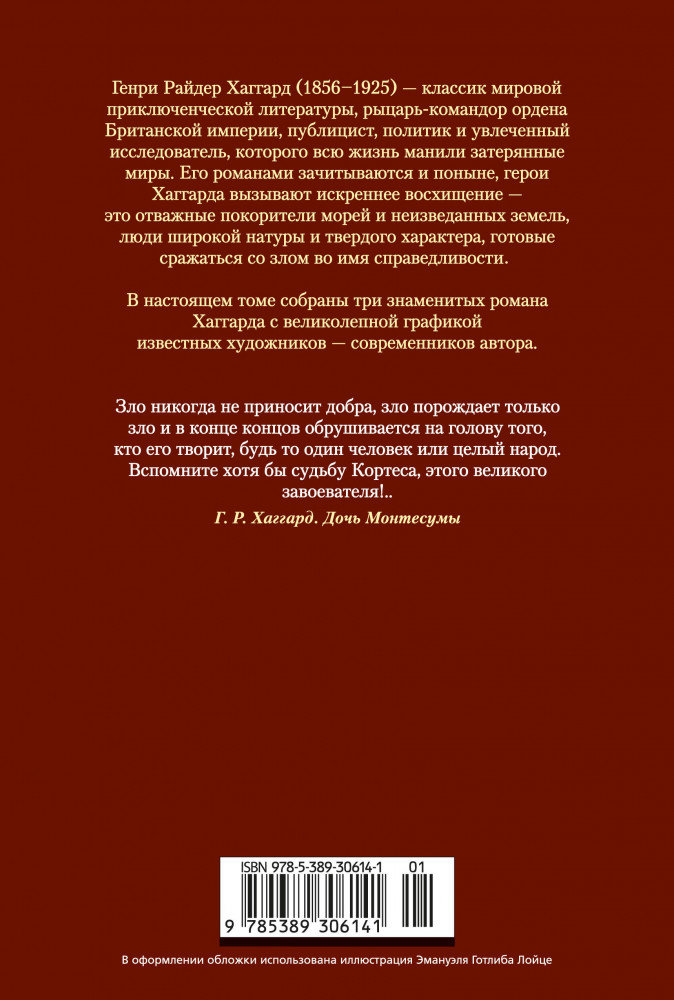 💳 Оплатить за товар можно при получении 🇰🇿 Есть бесплатная доставка по Казахстану от 1 дня 🎁 Копите бонусы с каждой покупки Генри Райдер Хаггард (1856–1925) — классик мировой приключенческой литературы, рыцарь-командор ордена Британской империи, публицист, политик и увлеченный исследователь, которого всю жизнь манили затерянные миры. Его романами зачитываются и поныне, герои Хаггарда вызывают искреннее восхищение — это отважные покорители морей и неизведанных земель, люди широкой натуры и твердого характера, готовые сражаться со злом во имя справедливости (с поправкой на точку зрения просвещенного империалиста, каковым являлся автор). |