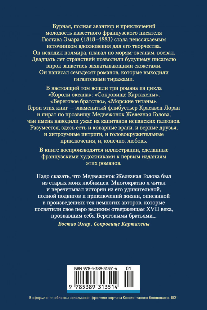 💳 Оплатить за товар можно при получении 🇰🇿 Есть бесплатная доставка по Казахстану от 1 дня 🎁 Копите бонусы с каждой покупки Бурная, полная авантюр и приключений молодость известного французского писателя Гюстава Эмара (1818–1883) стала неиссякаемым источником вдохновения для его творчества. Он исходил полмира, плавал по морям-океанам, воевал. Двадцать лет странствий позволили будущему писателю впрок запастись захватывающими сюжетами. Он написал семьдесят романов, которые выходили гигантскими тиражами. |