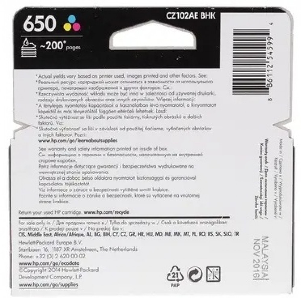 Картридж струйный HP 650 (CZ102AE) — многоцветный картридж, подходит для принтеров HP Deskjet Ink Advantage. Его легко устанавливать и в целом он прост в эксплуатации, а на выходе получаются качественные цветные изображения и тексты. Ресурс данного картриджа равен 200 страницам при 5% заполненности. При этом расход его чернил будет зависеть от степени заполненности страницы.