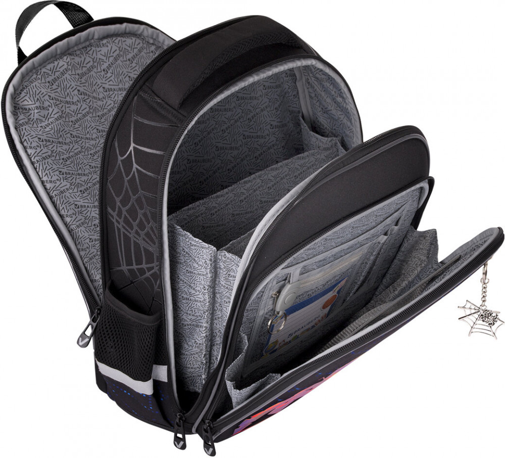 В основном отделении ранца можно легко и быстро разместить учебники и тетради между двумя плотными перегородками. Внутри фронтального отделения находится органайзер для канцтоваров, именная карточка, карман для телефона, карабин для ключей. Такая организация пространства поможет держать принадлежности в сохранности и приучить ребенка к порядку. Ранец широко раскрывается, повышая удобство использования, а за счёт боковых перегородок содержимое не выскользнет из ранца.
