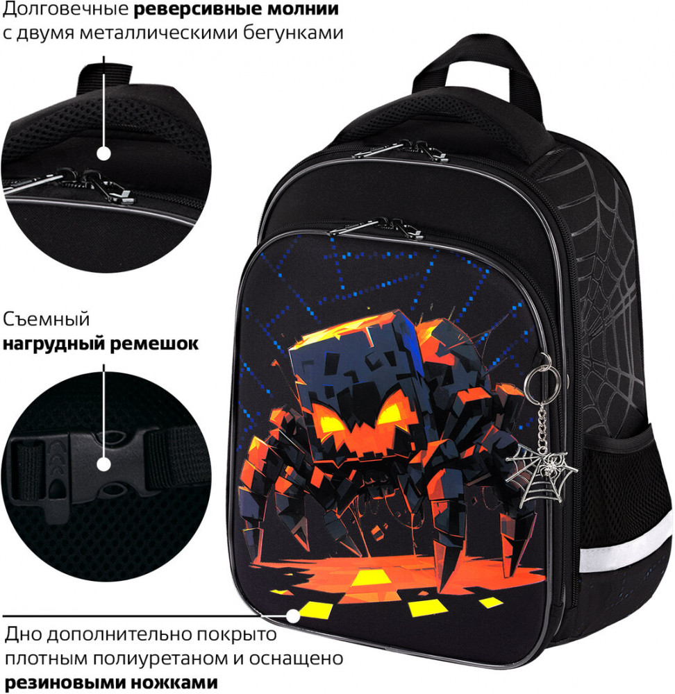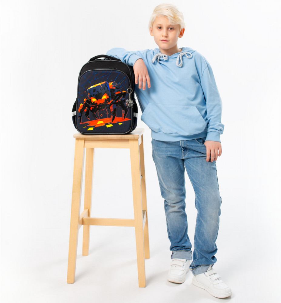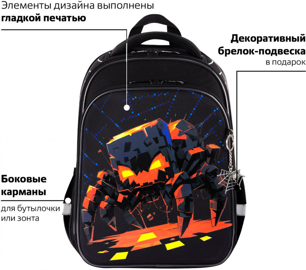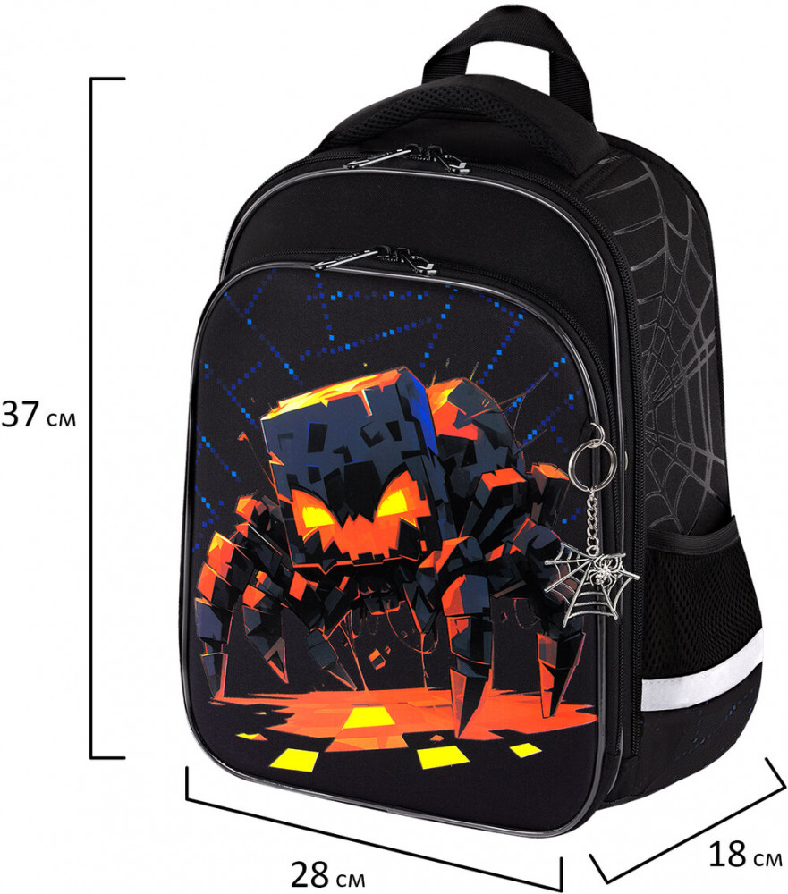 Рисунок на передней панели ранца выполнен шелкографией, что делает картинку реалистичной, а оригинальный брелок-подвеска дополняет дизайн ранца.