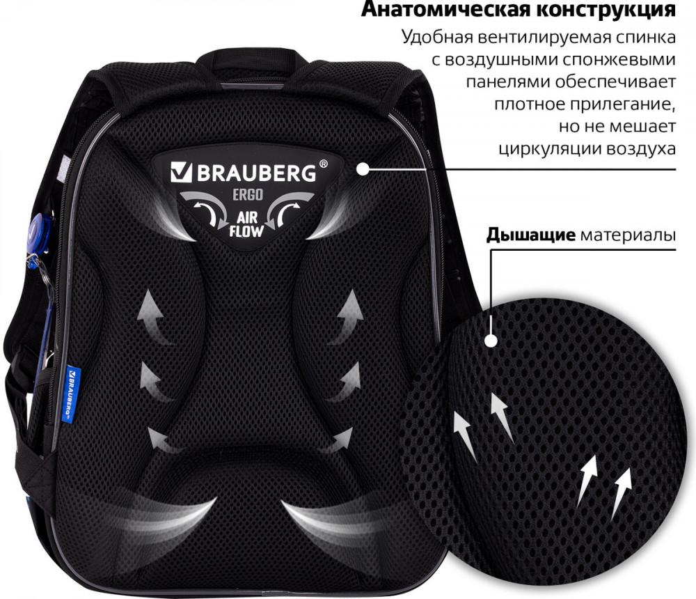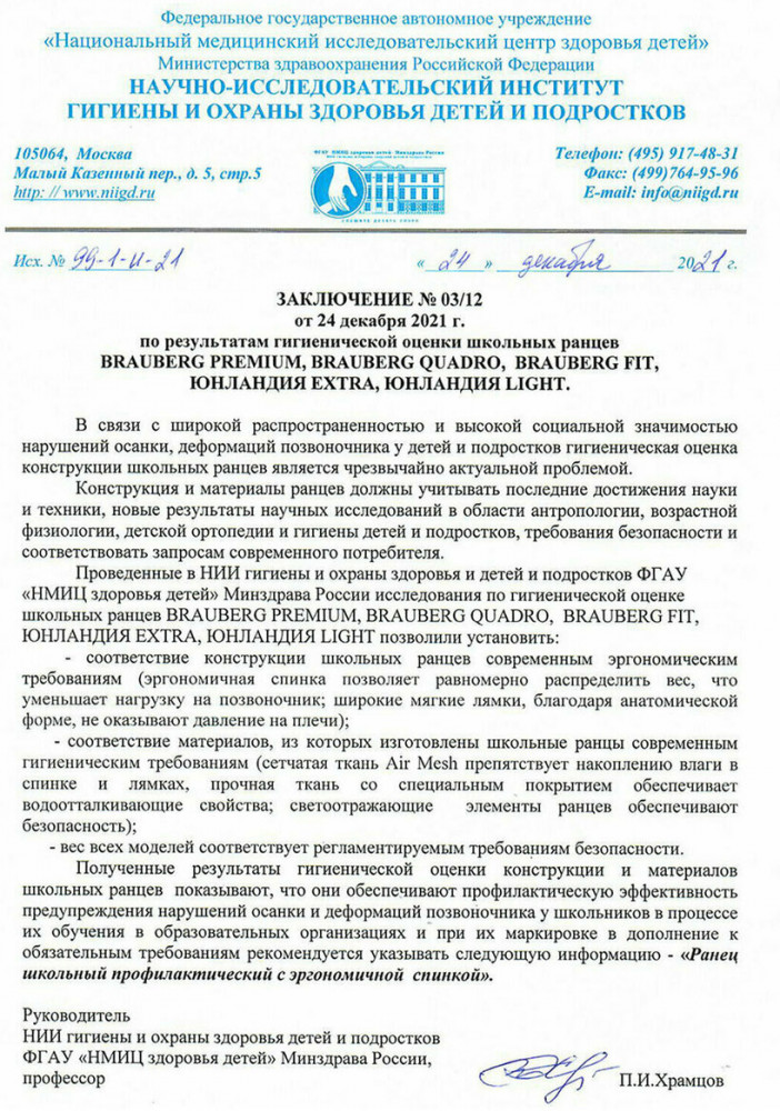 Ранцы BRAUBERG QUADRO протестированы НИИ гигиены и охраны здоровья детей и подростков ФГАУ «Национальный медицинский исследовательский центр здоровья детей». В рамках проведенных исследований* было установлено, что конструкции и материалы ученических ранцев соответствуют современным эргономическим требованиям и способствуют формированию здоровой осанки у школьников.