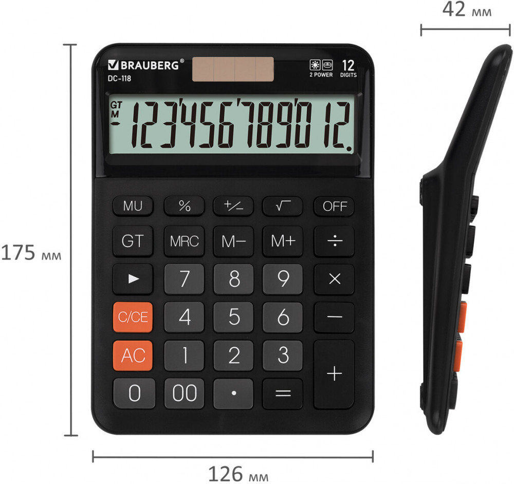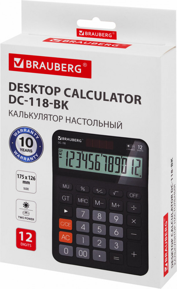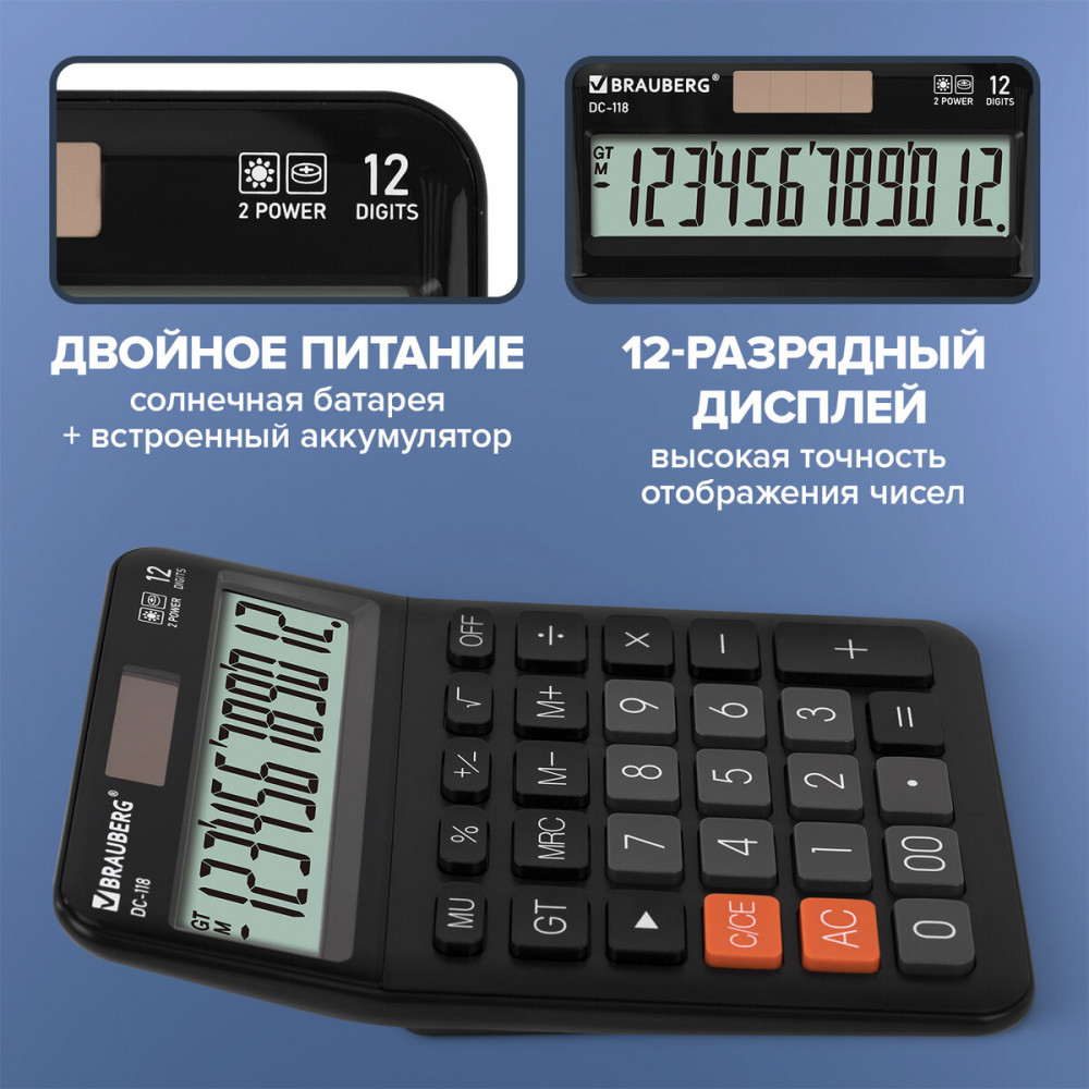 💳 Оплатить за товар можно при получении 🇰🇿 Есть бесплатная доставка по Казахстану от 1 дня 🎁 Копите бонусы с каждой покупки Настольный калькулятор Brauberg DC-118 сочетает стильный дизайн, устойчивый корпус и большие округлые кнопки для удобного ввода. Оснащение солнечной батареей делает его надежным помощником в офисе, школе и дома. Калькулятор выполняет все основные арифметические действия, вычисления с процентами, извлечение квадратного корня и расчёт наценки (MU). Удобен в работе благодаря клавишам корректировки числа, «00» и «GT» (общее суммирование), а также кнопкам для работы с памятью. Мощный аккумулятор и солнечная батарея обеспечивают работу при любом освещении. Клавиша выключения OFF и функция автоматического отключения (через 8–10 минут бездействия) значительно продлевают срок службы без замены батареи. |