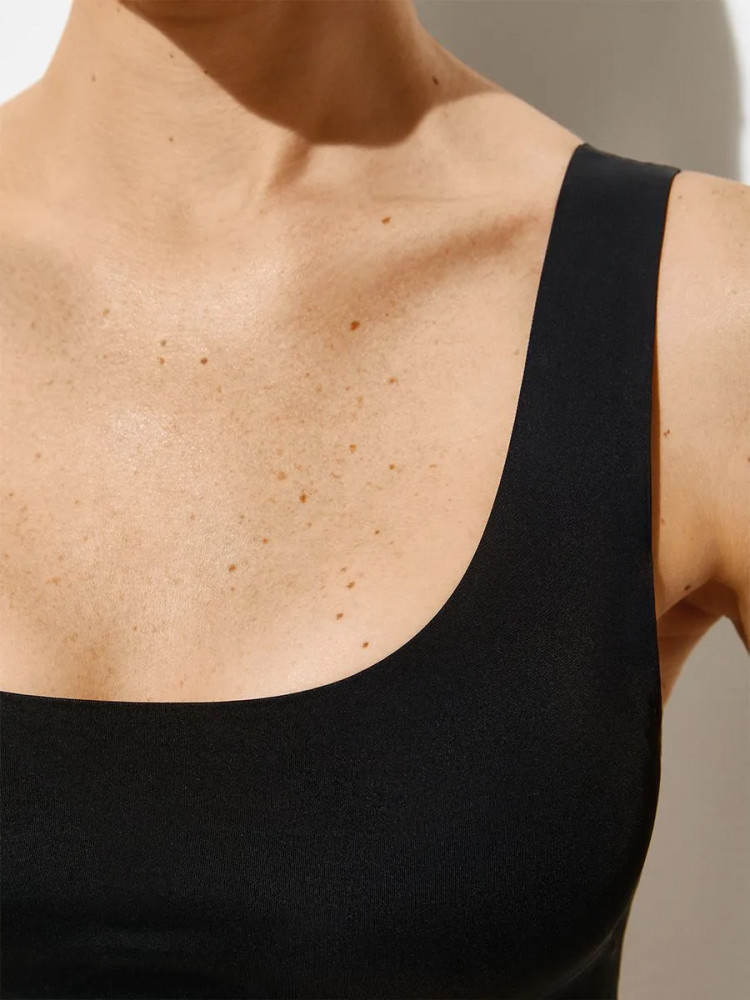 Базовый топ на широких бретелях со съемными формованными вкладышами. Изящно подчеркивает грудь и придает ей округлую форму. Изготовлен из гладкой микрофибры по прогрессивной технологии с использованием плоского клеевого шва и термоклеевой обработки края. Материал обладает высокой воздухопроницаемостью, приятно ощущается на теле, хорошо сохраняет форму и цвет. Передняя часть топа на подкладке дополнена съемными вкладышами. Топ превосходно облегает благодаря мягкой усиленной резинке, обеспечивает комфортную поддержку и создает эффект «второй кожи». Эстетичный и лаконичный топ идеально подходит в качестве повседневного базового нижнего белья. Гармонично сочетается с тонкой и облегающей одеждой.