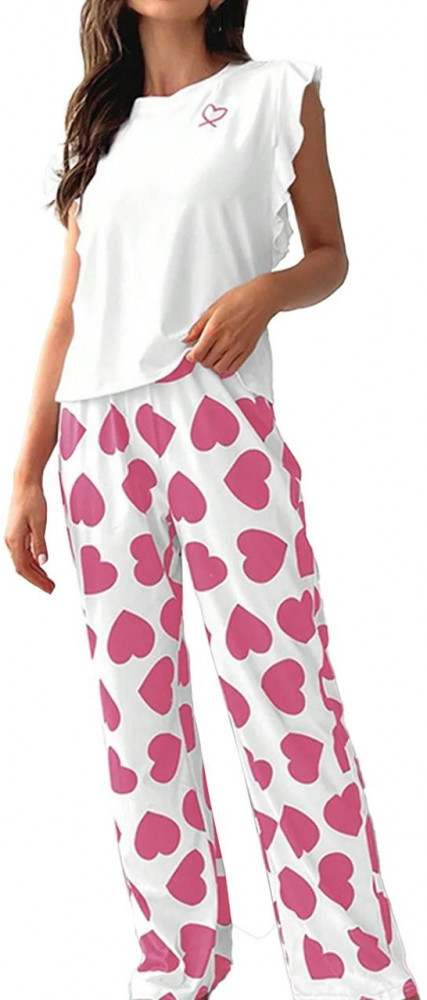 Погрузитесь в атмосферу уюта и нежности с нашим домашним комплектом-двойкой. Эта стильная пижама сочетает в себе элегантность и максимальный комфорт. Белоснежная футболка с коротким рукавом украшена изящными рюшами на плечах и лаконичной вышивкой в форме сердца. Свободные брюки с ярким принтом «большие сердца» имеют прямой крой и эластичный пояс, что обеспечивает идеальную посадку и свободу движений во время сна или отдыха.