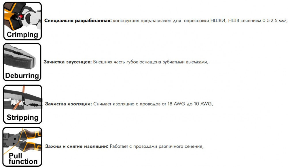 💳 Оплатить за товар можно при получении 🇰🇿 Есть бесплатная доставка по Казахстану от 1 дня 🎁 Копите бонусы с каждой покупки Плоскогубцы многофункциональные 8 в 1, 200 мм Super Ingco HMFCP28200 Industrial — это универсальный ручной инструмент, предназначенный для захвата деталей, в том числе круглой формы, зачистки проводов сечением 2.0–4.5 мм, резки медных проводов диаметром до 5 мм и опрессовки наконечников. Инструмент оснащён двухкомпонентными рифлёными рукоятками трёхцветного исполнения из TPR-пластика и прорезиненного материала, что предотвращает скольжение в руке и повышает комфорт при работе. Нижняя часть рукояток имеет дополнительные упоры с возможностью установки скобы с подвесом для удобного хранения. Применение высококачественной стали Cr-V обеспечивает длительный срок службы и устойчивость к нагрузкам. Плоскогубцы подходят для резки и зачистки пластика, медных и мягких проводов. Режущие кромки дополнительно закалены токами высокой частоты до твёрдости 55–60 HRC, что повышает износостойкость и точность реза. Антикоррозийная защита реализована за счёт тефлонового покрытия, которое предохраняет инструмент от коррозии и обеспечивает долговечность и надёжность в эксплуатации. |