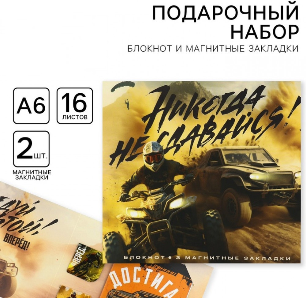 💳 Оплатить за товар можно при получении 🇰🇿 Есть бесплатная доставка по Казахстану от 1 дня 🎁 Копите бонусы с каждой покупки Подарочный набор «Никогда не сдавайся» — вдохновляющий и практичный подарок для тех, кто всегда идёт к своей цели. В комплект входит удобный блокнот для записей и 2 магнитные закладки, которые помогут быстро находить нужные страницы. Отличный вариант для учёбы, работы и личных заметок, а также для мотивационного подарка близкому человеку. |