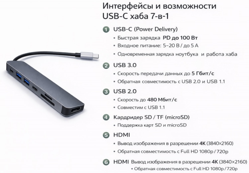 💳 Оплатить за товар можно при получении 🇰🇿 Есть бесплатная доставка по Казахстану от 1 дня 🎁 Копите бонусы с каждой покупки Представляем универсальный адаптер USB‑C 7‑в‑1 — компактный и стильный хаб, который расширит возможности вашего устройства. Он объединяет в себе семь необходимых интерфейсов и обеспечивает удобное подключение внешних устройств, носителей и мониторов. |