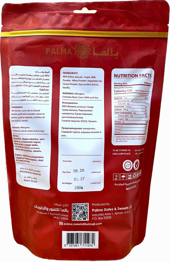 68% финики, печенье, сахар, сухое молоко, порошковая сыворотка, какао-порошок, растительный жир, соевый лецитин (Е322), ваниль. Содержит орехи, коровье молоко и сою.
