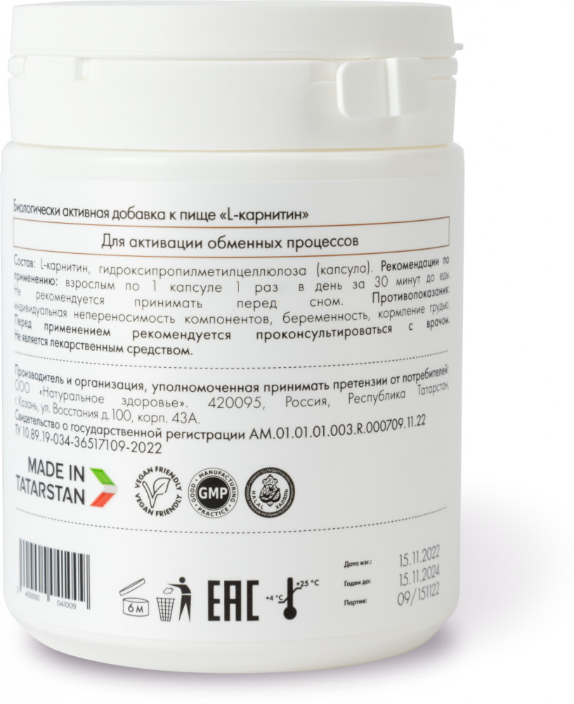 Л-карнитин — это высокоэффективная натуральная пищевая добавка, представленная в виде легкоусвояемых капсул из кукурузной муки и направленная на устранение дефицита Л-карнитина у женщин и мужчин. В суточной дозе карнитин л содержится 822 мг активного вещества.