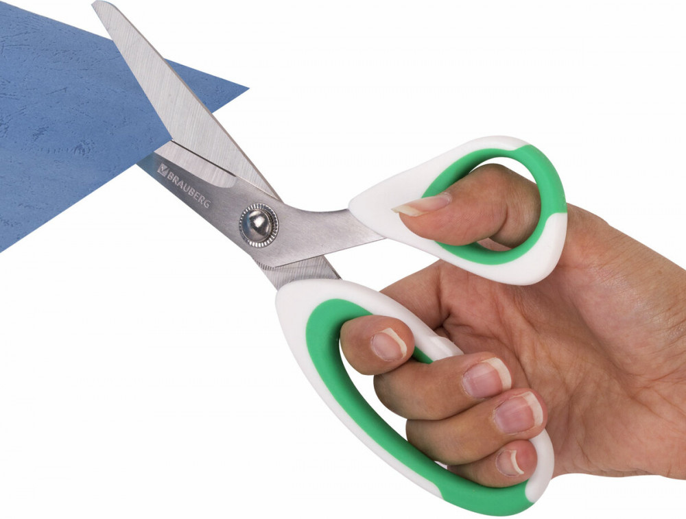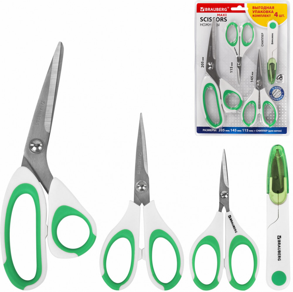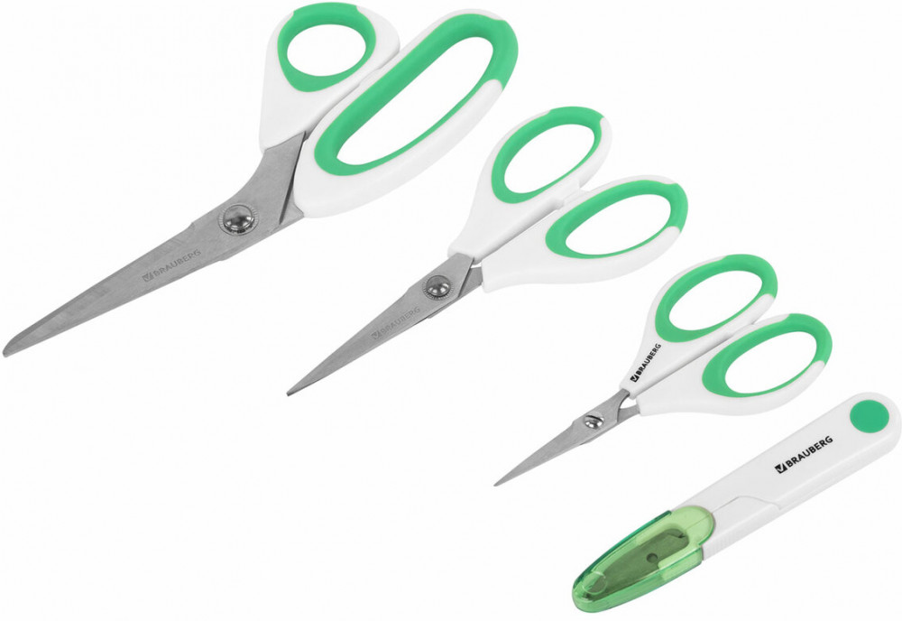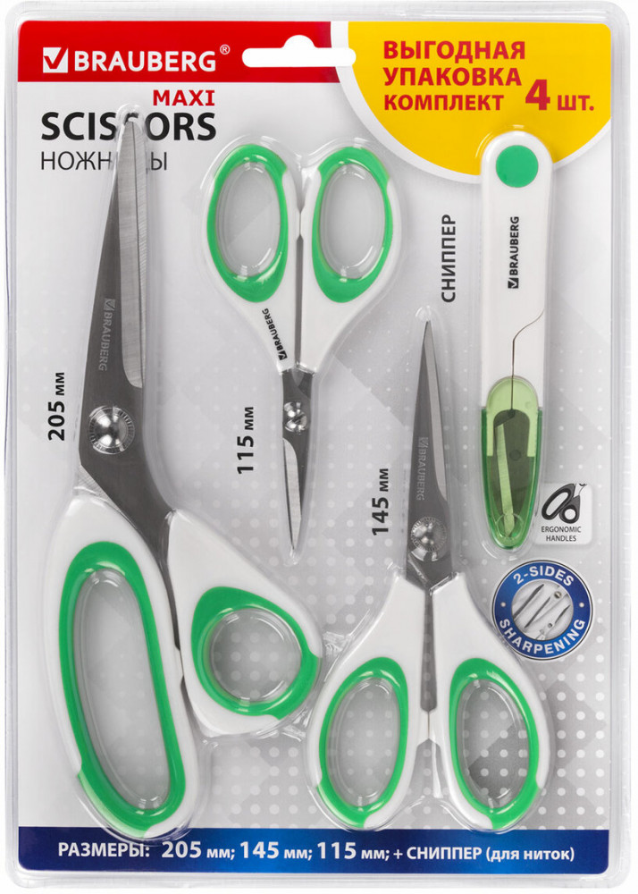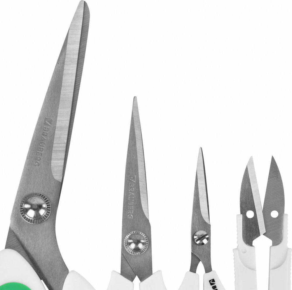 Комплект универсальных ножниц BRAUBERG. Эти ножницы идеально подходят для резки бумаги, картона и других материалов, что делает их незаменимыми как в офисе, так и дома.
