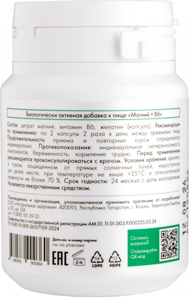 Магний В6 от Natural Health представляет собой комплексный продукт, комбинирующий магний с пиридоксином гидрохлоридом (витамин B6). Благодаря своему уникальному составу, эти бады обеспечивают поддержку нервной системы во время тревожных периодов. В современных препаратах магний присутствует в разных формах: карбонат, лактат, цитрат, хелат и т.д. Отличие между ними в том, что они по-разному усваиваются организмом. Капсулы с магнием В6 от Natural Health идет в форме магния цитрат.
