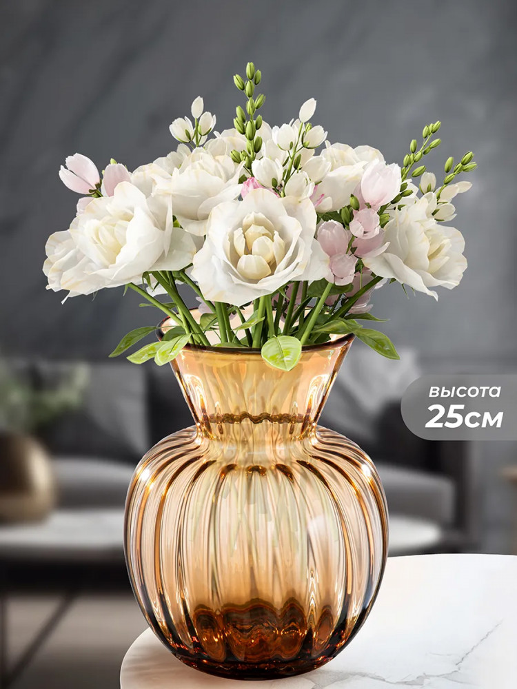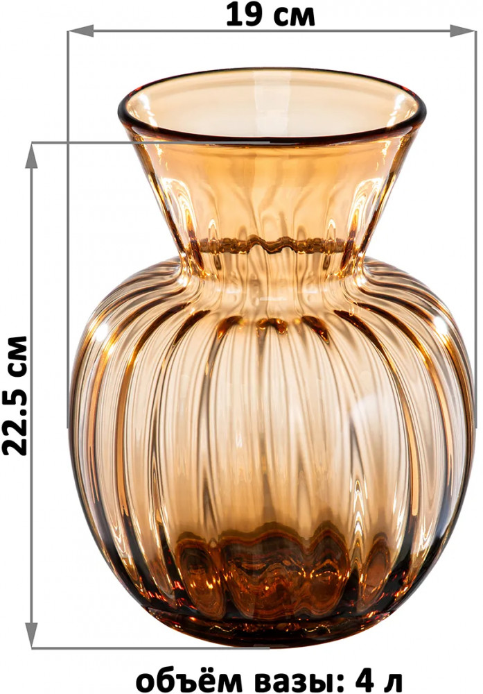 Ваза ручной выдувки от Elan Gallery послужит эстетичным и функциональным дополнением вашего интерьера. Размер изделия — 19×19×25,5 см, объём — 4 литра. Внутренний диаметр горлышка сверху — 12,5 см. Диаметр самой узкой части вазы — 8,5 см. Выполнена из стекла. Полупрозрачная коричневая поверхность украшена внутренней рельефной огранкой. Подойдёт для букетов на длинных стеблях, а также декоративных ветвей. Изделие станет прекрасным элементом декора вашей гостиной, спальни или прихожей, наполнив дом атмосферой гармонии и уюта. Это отличный вариант для живых и искусственных веток и цветков, а также для сухоцветов. Поставьте в неё букет из свежих тюльпанов, пионов и роз. Расположите еловые и вербовые веточки, чтобы привнести изысканности в квартиру, студию или загородный дом. Изящная ваза добавит утончённости и красоты в оформление любого праздника или вечеринки. Благодаря уникальной форме стеклянная ёмкость прекрасно смотрится даже без наполнения.