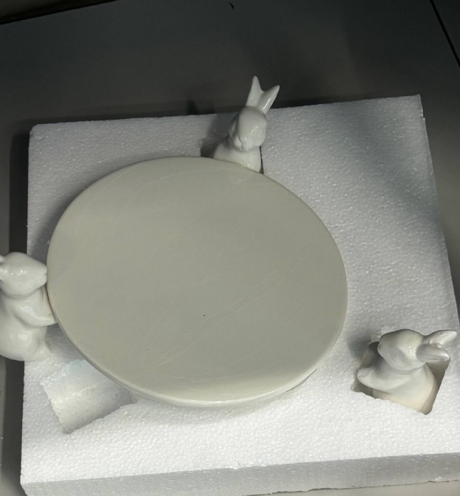 Блюдо «Кролики» предназначено для эстетичной подачи блюд и закусок. Размер изделия — 30×30×10,5 см. Размер блюда — 23×23×1 см. Выполнено из белого фарфора. Он не впитывает цвет продуктов и легко отмывается, благодаря чему надолго сохраняет свою белизну. Представляет собой фигурную композицию с тремя кроликами, держащими блюдо в лапках. Размер каждой фигурки — 5,5×5х10,5 см. Расстояние до блюда — 5,5 см. Используйте изделие для подачи к столу ваших любимых десертов. Красиво положите на него бутерброды из хлеба с сырной или мясной нарезкой, чтобы подкрепиться на завтрак. Разложите роллы, салаты, свежие овощи и фрукты, подайте конфеты или другие сладости. Идеально подойдёт для подачи различных блюд и угощений, например, торта или пирога. Такое блюдо станет оригинальным украшением вашего стола и необычным дополнением кухонного инвентаря!