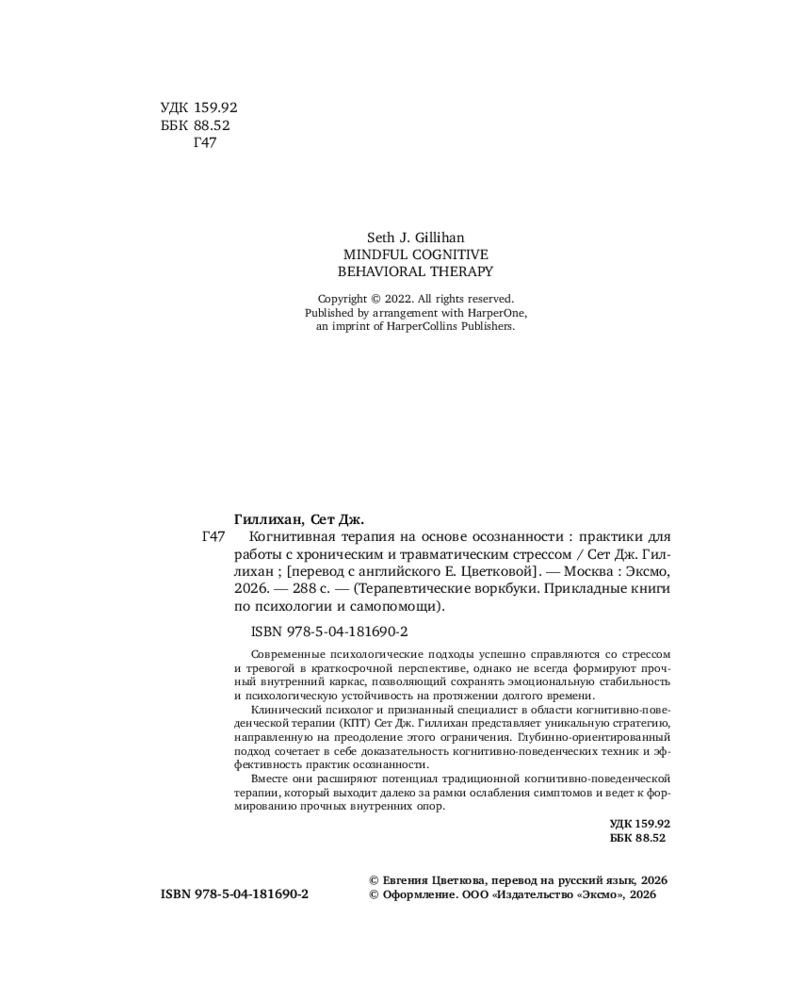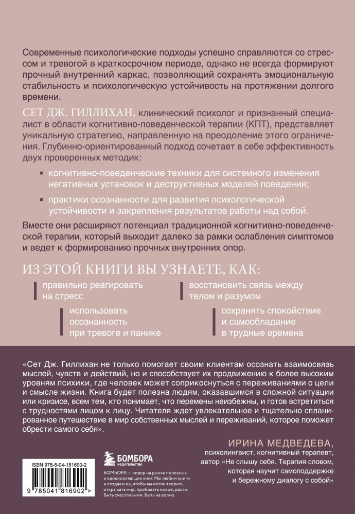 💳 Оплатить за товар можно при получении 🇰🇿 Есть бесплатная доставка по Казахстану от 1 дня 🎁 Копите бонусы с каждой покупки Серия: Терапевтические воркбуки. Прикладные книги по психологии и самопомощи Современные психологические подходы успешно справляются со стрессом и тревогой в краткосрочной перспективе, однако не всегда формируют прочный внутренний каркас, позволяющий сохранять эмоциональную стабильность и психологическую устойчивость на протяжении долгого времени. Клинический психолог и признанный специалист в области когнитивно-поведенческой терапии (КПТ) Сет Дж. Гиллихан представляет уникальную стратегию, направленную на преодоление этого ограничения. |
