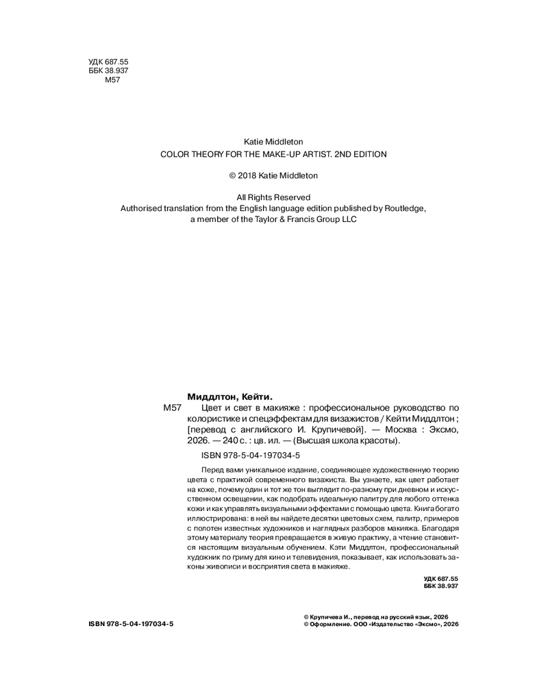 💳 Оплатить за товар можно при получении 🇰🇿 Есть бесплатная доставка по Казахстану от 1 дня 🎁 Копите бонусы с каждой покупки Серия: Высшая школа красоты. Профессиональные издания для специалистов бьюти-индустрии Автор книги Кейти Миддлтон, профессиональный художник по гриму для кино и телевидения, преподаватель с более чем 20-летним опытом, делится своими знаниями, которые соединяют искусство живописи, законы света и цветовой теории с современными техниками макияжа. Вы узнаете, как цвет работает на коже, почему один и тот же тон выглядит по-разному при дневном и искусственном освещении, как подобрать идеальную палитру для любого оттенка кожи и как управлять визуальными эффектами с помощью цвета. |