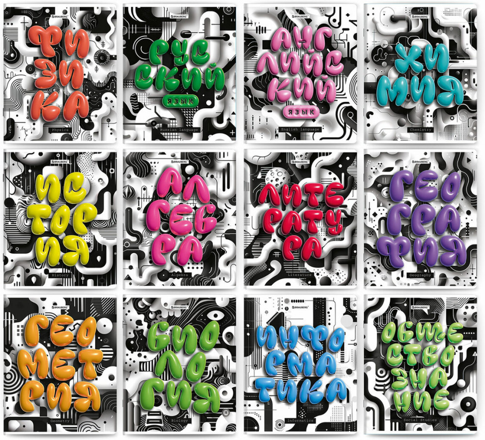В комплекте 12 тетрадей: Алгебра, Английский язык, Биология, География, Геометрия, Обществознание, История, Информатика, Литература (в линию), Русский язык (в линию), Физика, Химия.