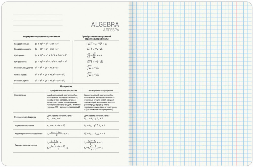 Тетради содержат 48 листов, изготовленных из высококачественной офсетной бумаги плотностью 60 г/м2 и 100% белизны, с красными полями. Листы соединены скобами. Обложка изготовлена из мелованного картона. Благодаря глянцевому лаку краски на изображении становятся более яркими и насыщенными. В справочном материале собраны основные подсказки по школьному предмету. |