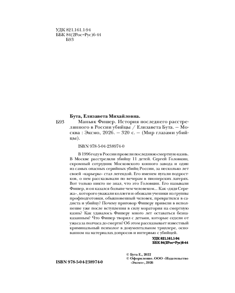 💳 Оплатить за товар можно при получении 🇰🇿 Есть бесплатная доставка по Казахстану от 1 дня 🎁 Копите бонусы с каждой покупки Серия: Мир глазами убийцы В 1996 году в России провели последнюю смертную казнь. В Москве расстреляли убийцу 11 детей. Сергей Головкин, скромный сотрудник Московского конного завода и один из самых опасных серийных убийц России, за несколько лет своей «карьеры» стал легендой. Его именем пугали подростков, о нем рассказывали по вечерам в пионерских лагерях. Вот только никто не знал, что это Головкин. Его называли «Фишер», и он казался больше, чем человеком... Как «дядя Сережа», которого уважали коллеги и обожали ученики из группы профподготовки, обыкновенный человек, превратился в садиста и убийцу? Почему приговор Фишеру привели в исполнение уже после вступления в силу моратория на смертную казнь? Как удавалось Фишеру много лет оставаться безнаказанным? Что Фишер творил с детьми, которые седели от ужаса за полчаса до смерти? Об этом рассказывает известный криминальный психолог в документальном триллере, основанном на материалах допросов и интервью с убийцей. |