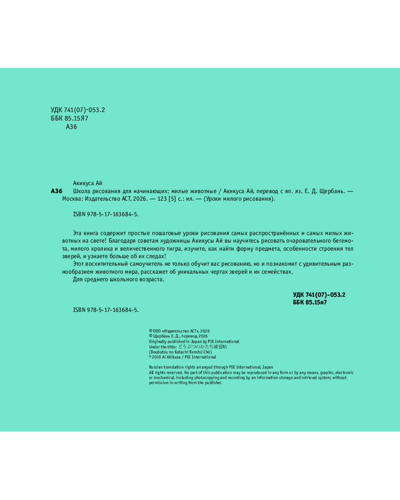 💳 Оплатить за товар можно при получении 🇰🇿 Есть бесплатная доставка по Казахстану от 1 дня 🎁 Копите бонусы с каждой покупки Серия: Уроки милого рисования Эта книга содержит простые пошаговые уроки рисования самых распространённых и самых милых животных на свете! Благодаря советам художницы Акикусы Ай вы научитесь рисовать очаровательного бегемота, милого кролика и величественного тигра, изучите, как найти форму предмета, особенности строения тел зверей, и узнаете больше об их следах! |