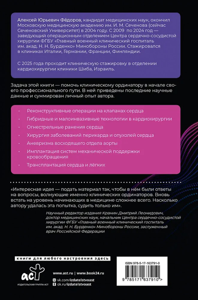 💳 Оплатить за товар можно при получении 🇰🇿 Есть бесплатная доставка по Казахстану от 1 дня 🎁 Копите бонусы с каждой покупки Серия: Профессиональный взгляд Задача этой книги — помочь сделать первые шаги в профессии молодому специалисту. В ней заложена попытка автора посмотреть на этап клинической ординатуры глазами хирурга, обладающего опытом и знаниями, правильно расставить акценты и предостеречь от возможных ошибок, цена которых в кардиохирургии традиционно высока. Материал будет полезен студентам, интересующимся кардиохирургией, участникам студенческих научных кружков, клиническим ординаторам, аспирантам и врачам — сердечно-сосудистым хирургам в первые годы самостоятельной работы. |