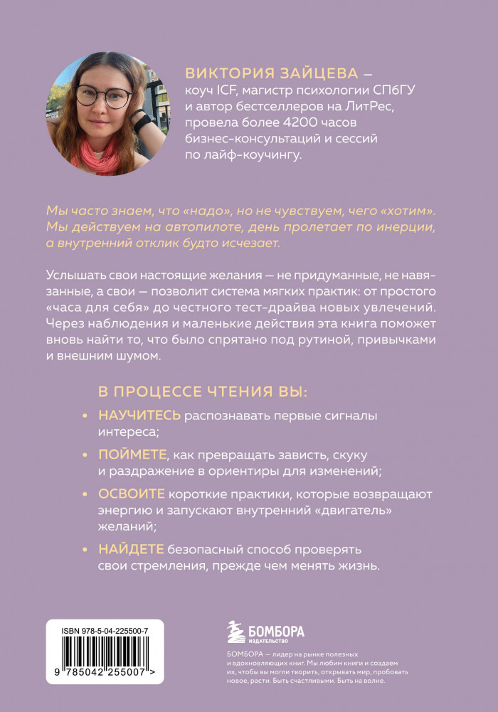 💳 Оплатить за товар можно при получении 🇰🇿 Есть бесплатная доставка по Казахстану от 1 дня 🎁 Копите бонусы с каждой покупки Серия: Книжная терапия Виктория Зайцева — коуч ICF, психолог и автор бестселлеров на Литрес, провела более 4200 часов бизнес-консультаций и сессий по лайф-коучингу. Мы часто знаем, что «надо», но не чувствуем, чего «хотим». Мы действуем на автопилоте, день пролетает по инерции, а внутренний отклик будто исчезает. Услышать свои настоящие желания — не придуманные, не навязанные, а свои — позволит система мягких практик: от простого «часа для себя» до честного тест-драйва новых увлечений. Через наблюдения и маленькие действия эта книга поможет вновь найти то, что было спрятано под рутиной, привычками и внешним шумом. |
