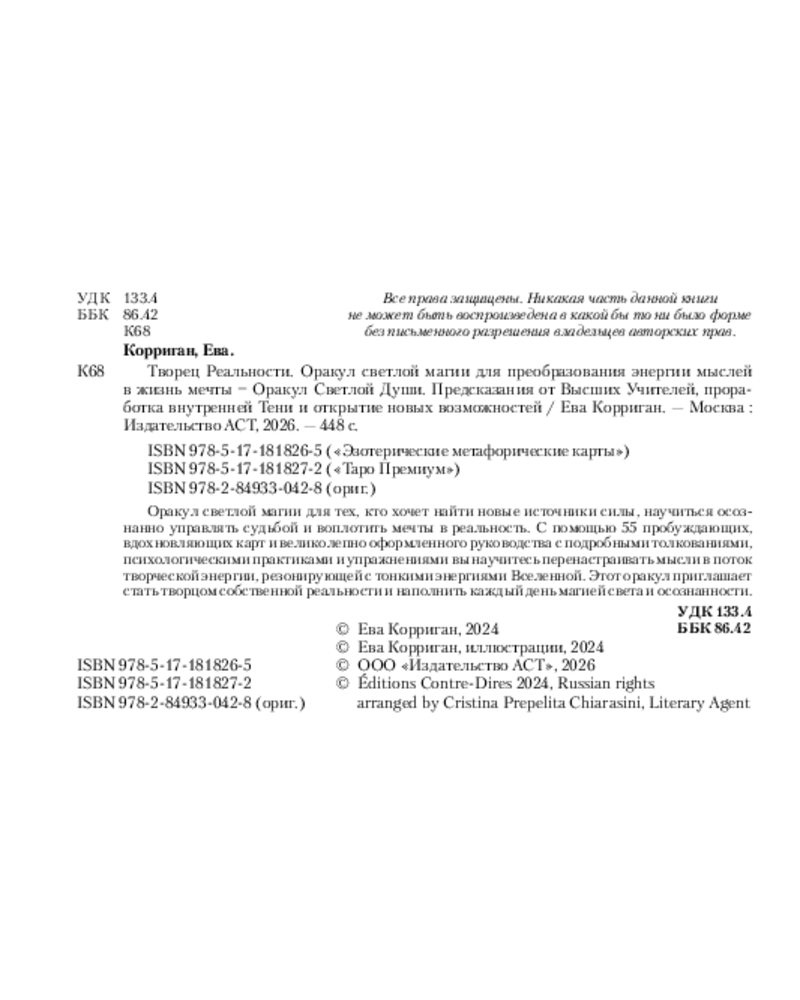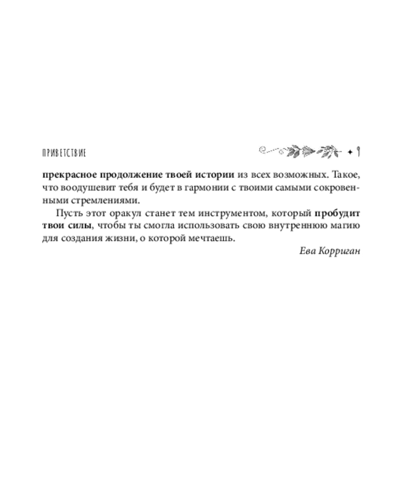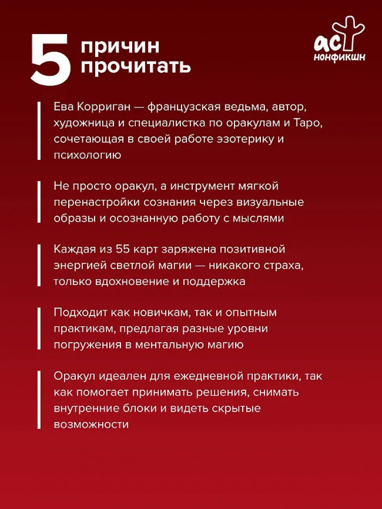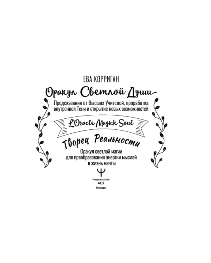 | Ева Корриган — французская магическая ведьма, получившая образование в области психологии и окончившая Парижскую школу изящных искусств, автор, художница и специалистка по оракулам и Таро. В своей работе сочетает профессиональные знания с личной чуткостью, чтобы помогать другим раскрывать их внутреннюю магию и создавать жизнь, соответствующую истинным желаниям. |